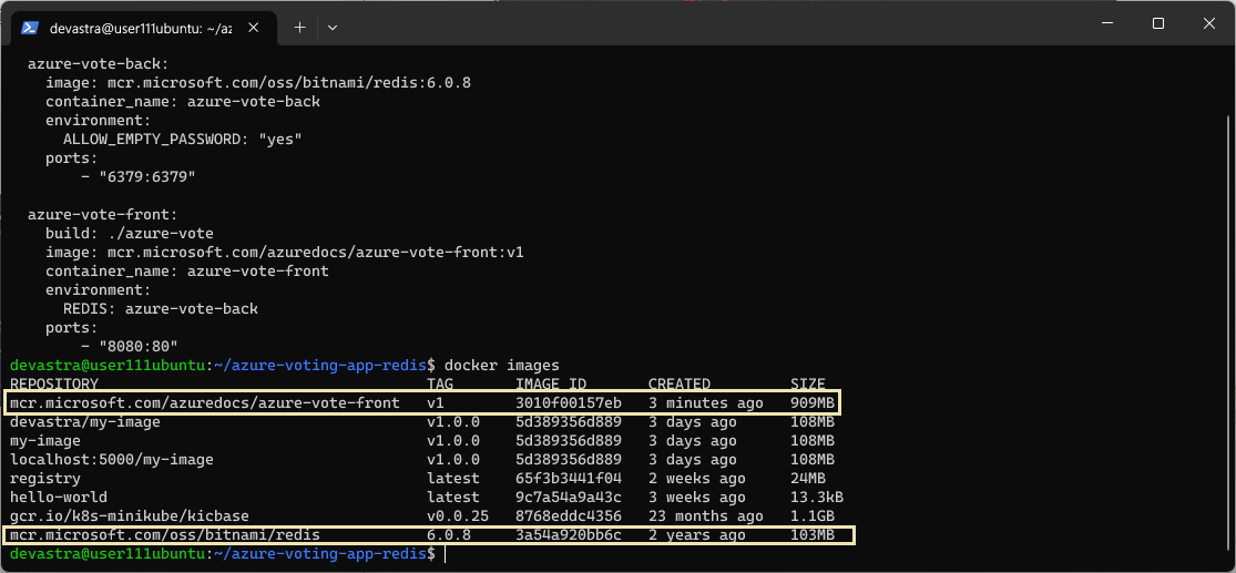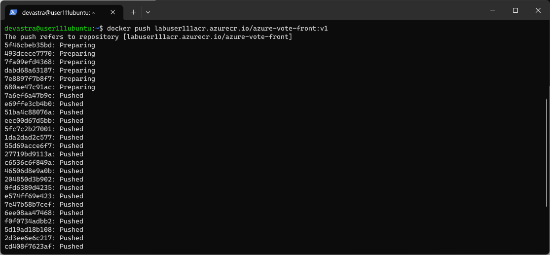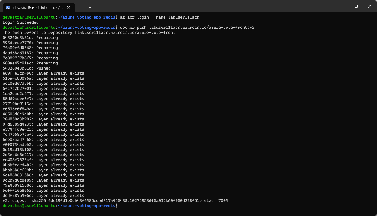$ docker push labuser111acr.azurecr.io/azure-vote-front:v1