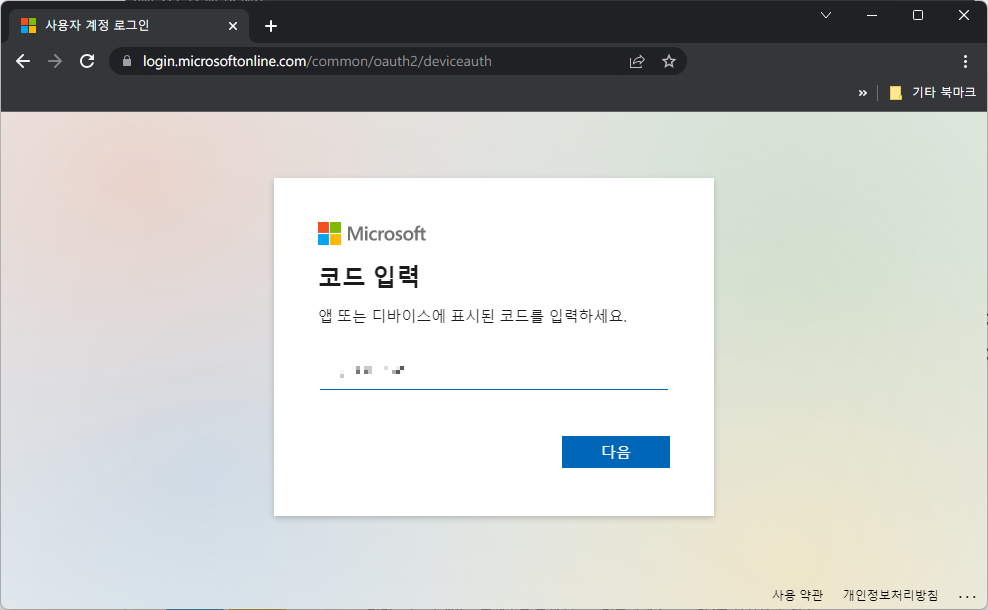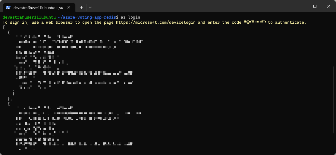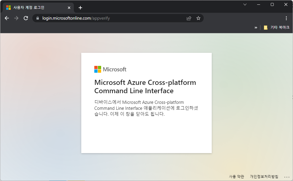 - 다음 명령을 실행하여 애저(Azure)에 로그인을 한다. 터미널에서 접속해야 할 URL과 인증 코드를 보여준다. 로컬 PC의 웹 브라우저의 검색창에 입력하여 인증 코드를 입력한다. 인증 및 로그인에 성공하면 구독 정보가 표시된다.