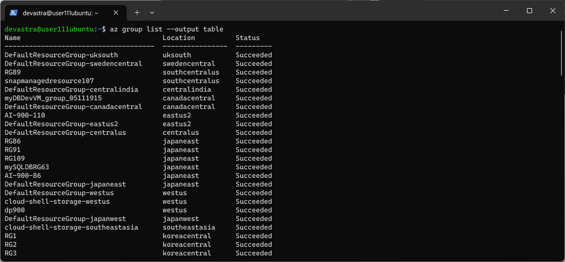 $ az group list --output table | grep <리소스그룹이름> # <리소스그룹이름> 조회