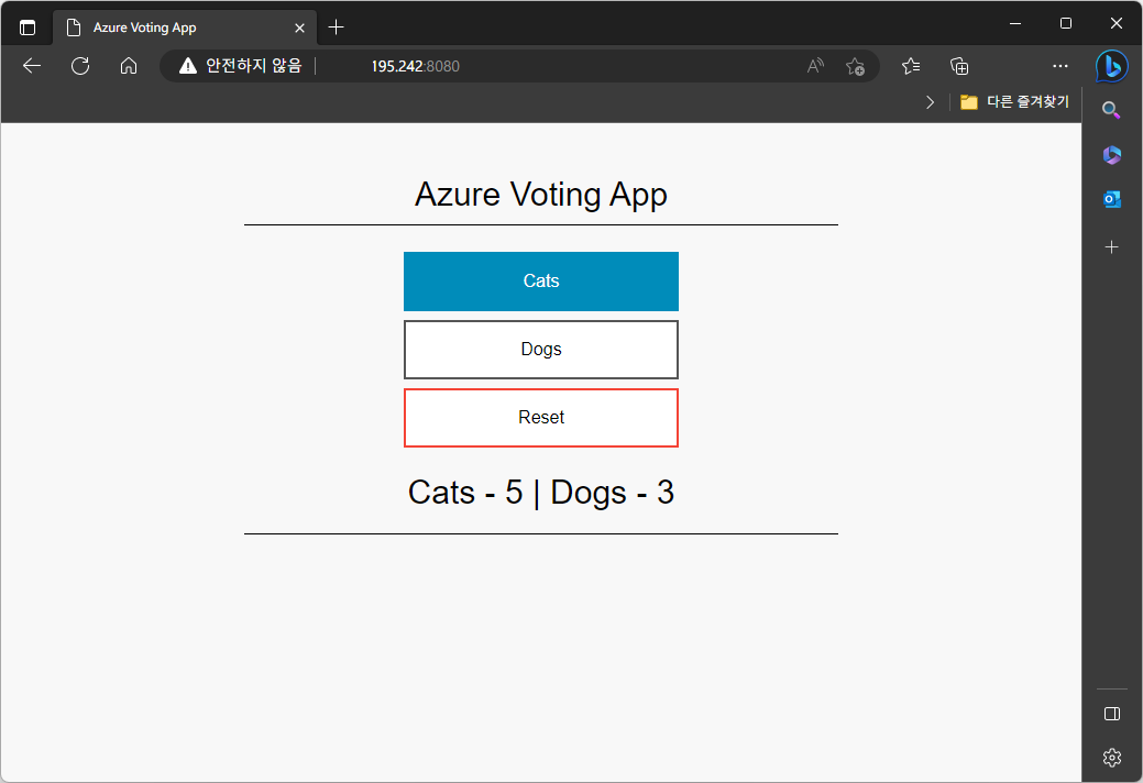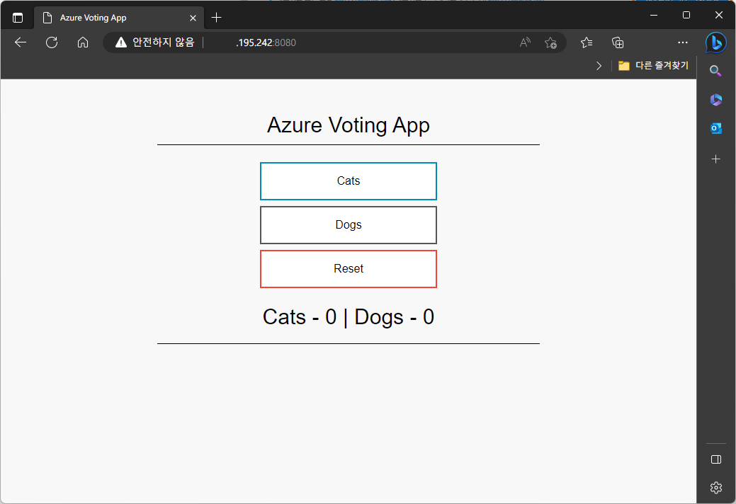 - 업데이트된 컨테이너 이미지에 변경 내용이 적용되었는지 확인해보기 위해 웹 브라우저에서 공용 IP 주소와 포트 번호를 통해 접속해본다.