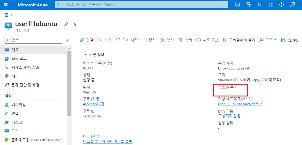 - 공용 IP 주소 : 애저 포털의 우분투 VM의 공용 IP 주소