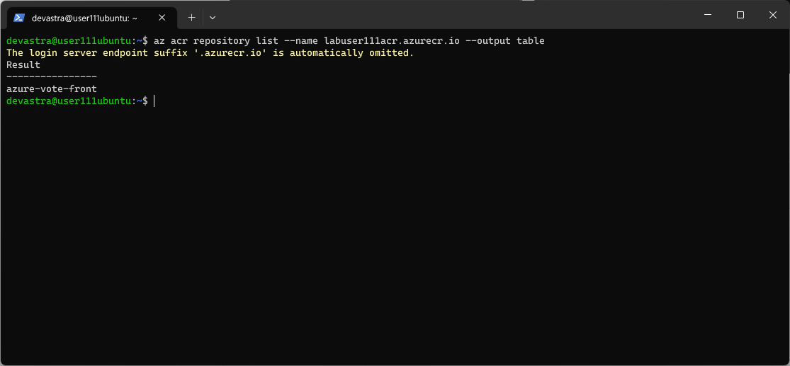 $ az acr repository list --name labuser111acr.azurecr.io --output table