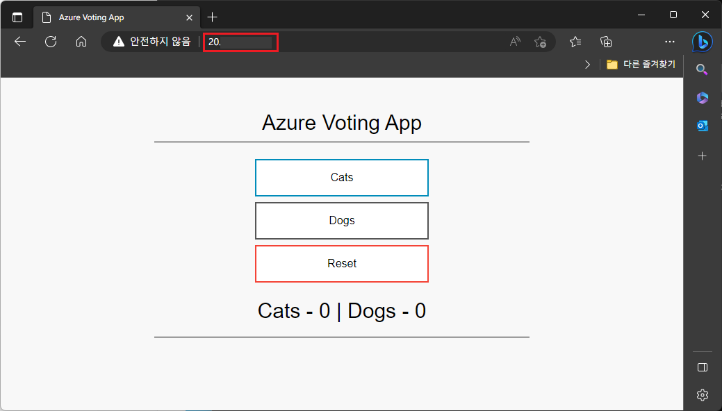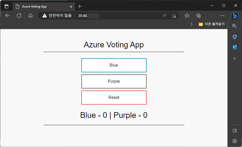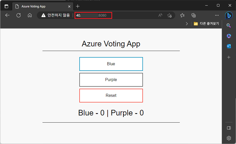 - 다음 명령을 실행하여 @azure-vote-front@서비스의 외부 IP 주소(@EXTERNAL IP@)를 가져온다. 그리고 복사한다.