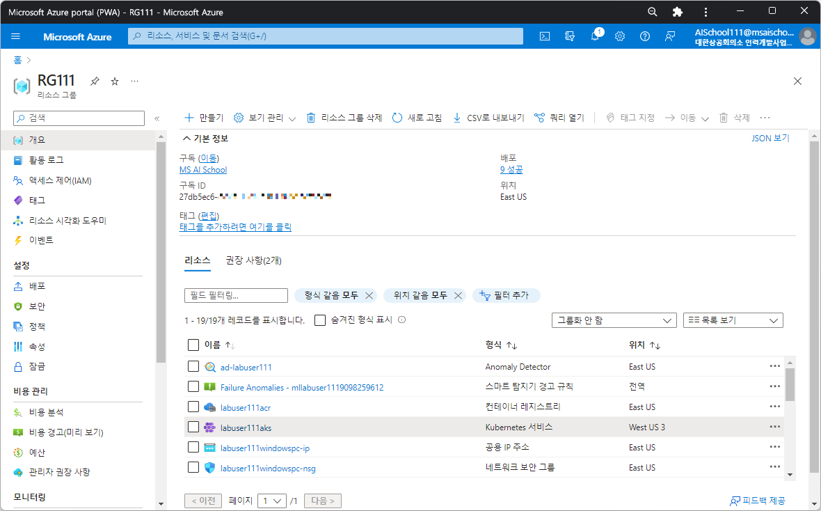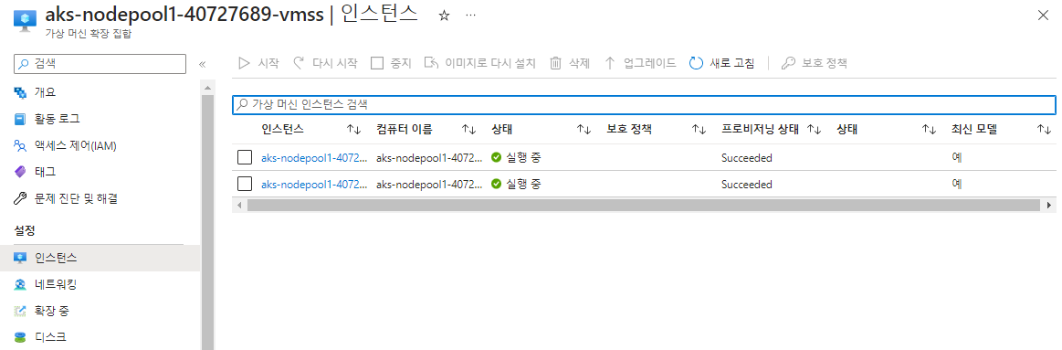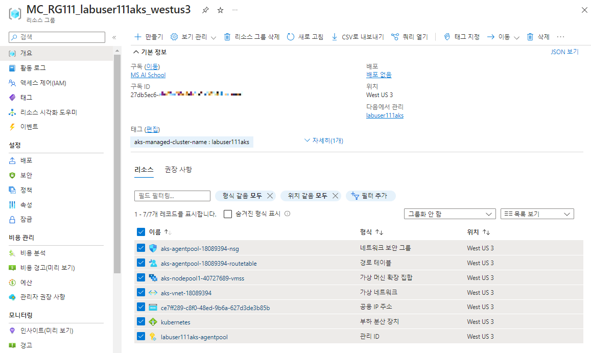 - 애저 포털의 본인의 리소스 그룹 페이지에서 AKS가 성공적으로 설치되었는지 확인한다.