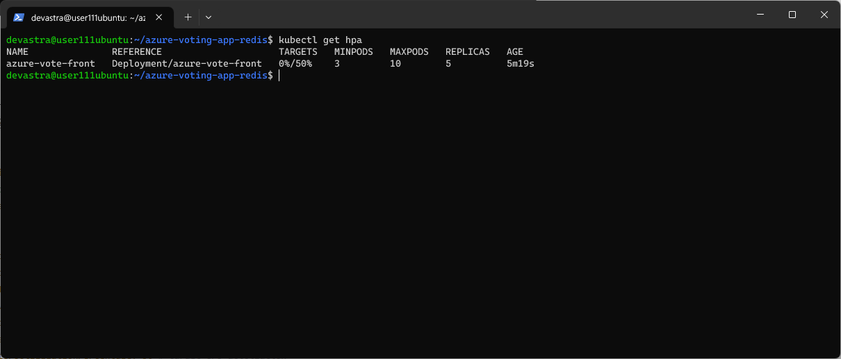 $ kubectl autoscale deployment azure-vote-front --cpu-percent=50 --min=3 --max=10