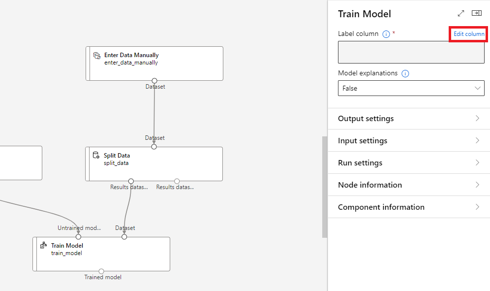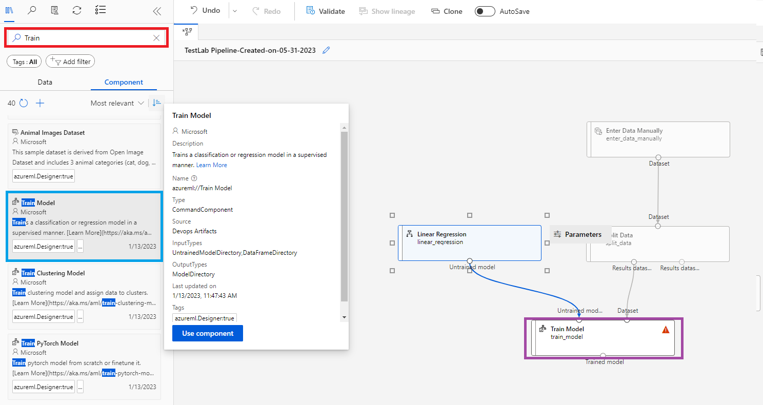 - 컴포넌트 검색창에 @[Train]@을 검색한 후, @[Train Model]@ 컴포넌트를 끌어온다. 그리고 아래 그림처럼 @[Split Data]@ 컴포넌트와 @[Linear Regression]@ 컴포넌트를 @[Train Model]@ 컴포넌트에 연결해준다.