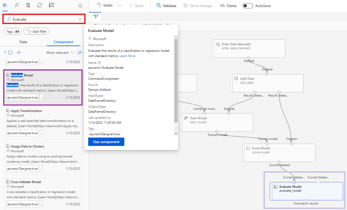 - 컴포넌트 검색창에 @[Evaluate]@을 검색한 후, @[Evaluate Model]@ 컴포넌트를 끌어온다. 그리고 아래 그림처럼 @[Score Model]@ 컴포넌트의 @Scored dataset@을 @[Evaluate Model]@ 컴포넌트에 연결해준다. 그리고 우측 상단의 @[Submit]@ 버튼을 클릭한다.
