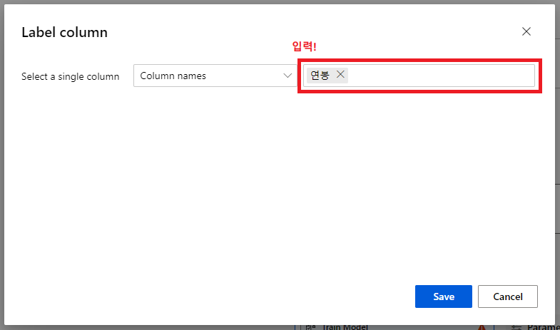 - @[Train Model]@ 컴포넌트에 경고 표시가 되어있다. 레이블 컬럼(Label Column)이 설정되지 않았기 때문이다. 이 문제를 해결하기 위해 @[Train Model]@ 컴포넌트를 더블 클릭한 후, @Label Column@을 @연봉@으로 설정해준다.