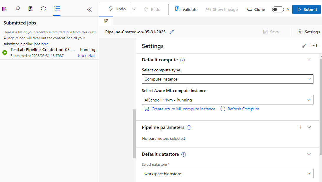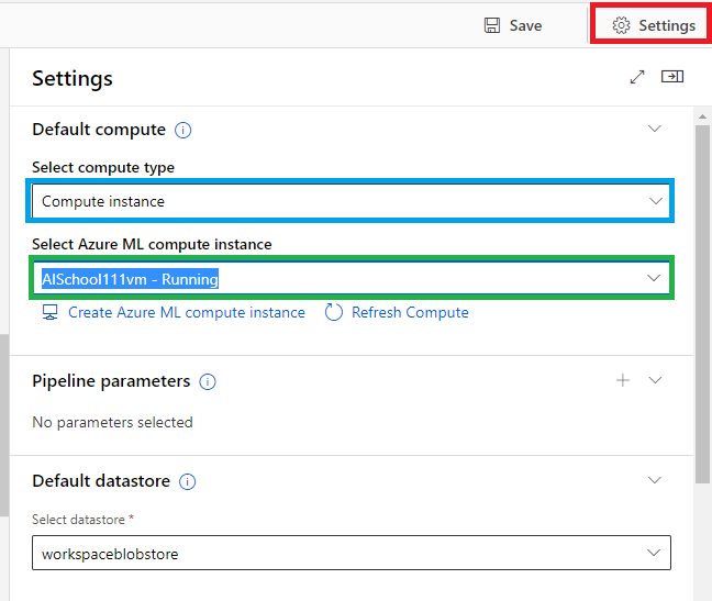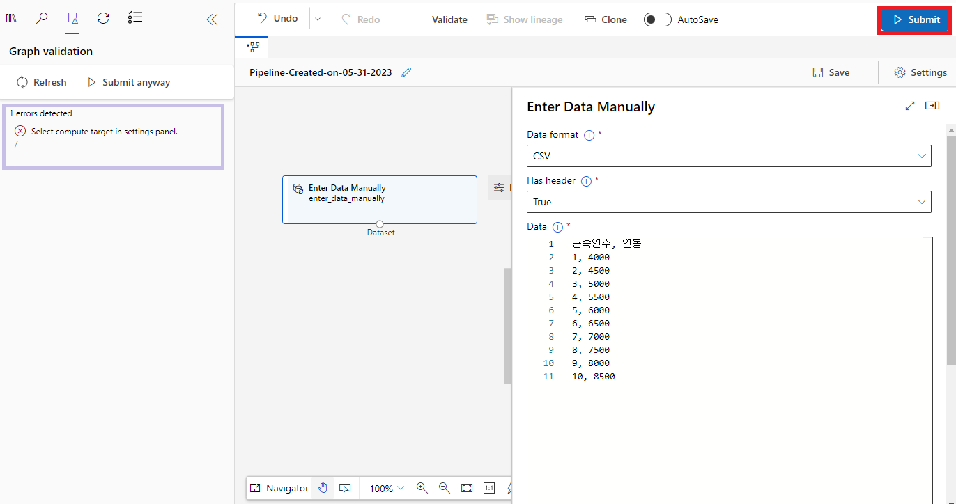 - 좌측 상단에서 @[Settings]@ 버튼을 클릭한 후, Compute Type을 @Compute Instance@로 설정한다. 그리고 Compute Instance를 생성했던 처음에 생성했던 가상 머신을 설정해준다. 그리고 상단의 @[Submit]@ 버튼을 클릭한다.