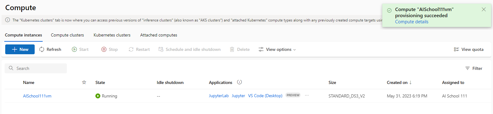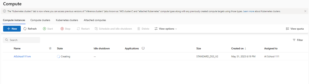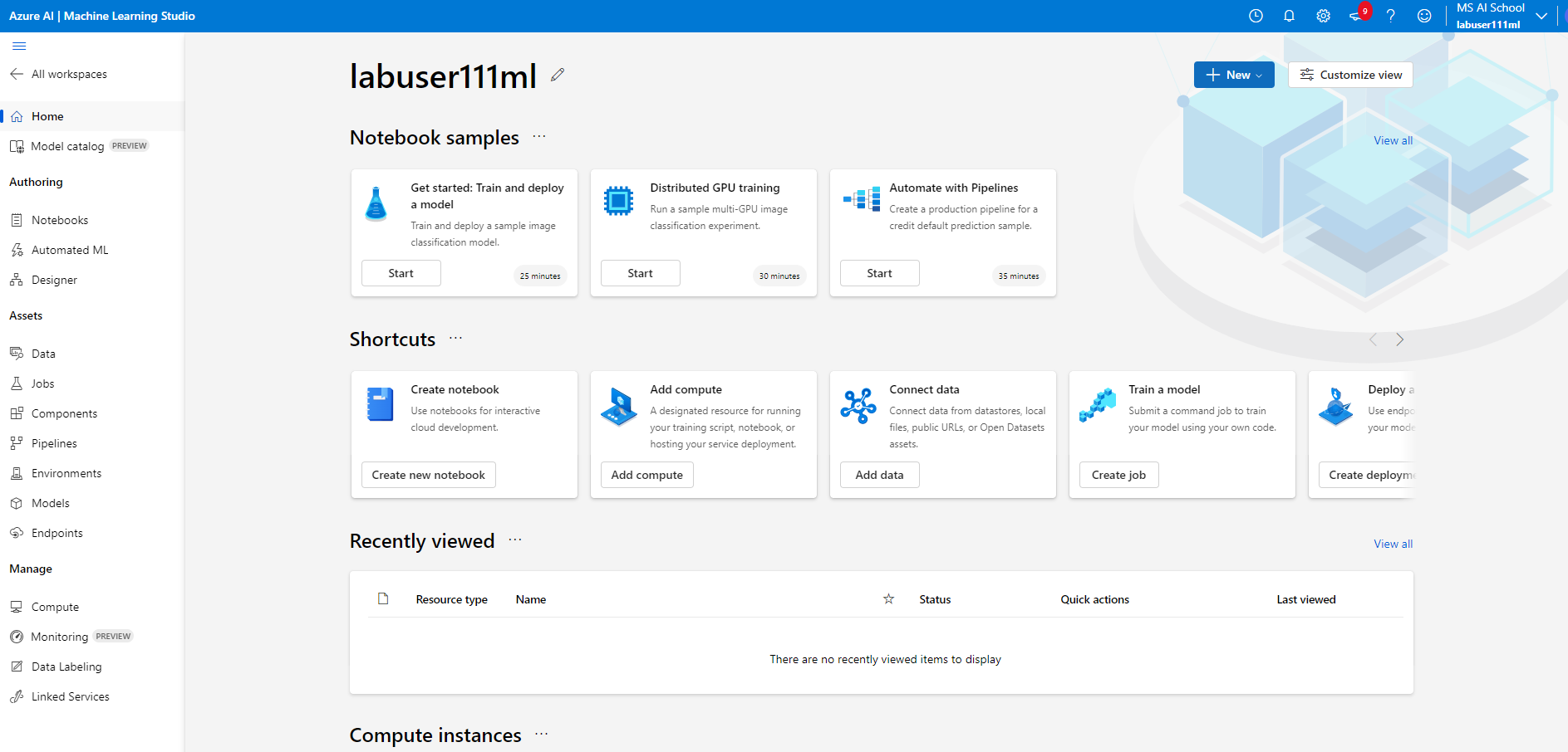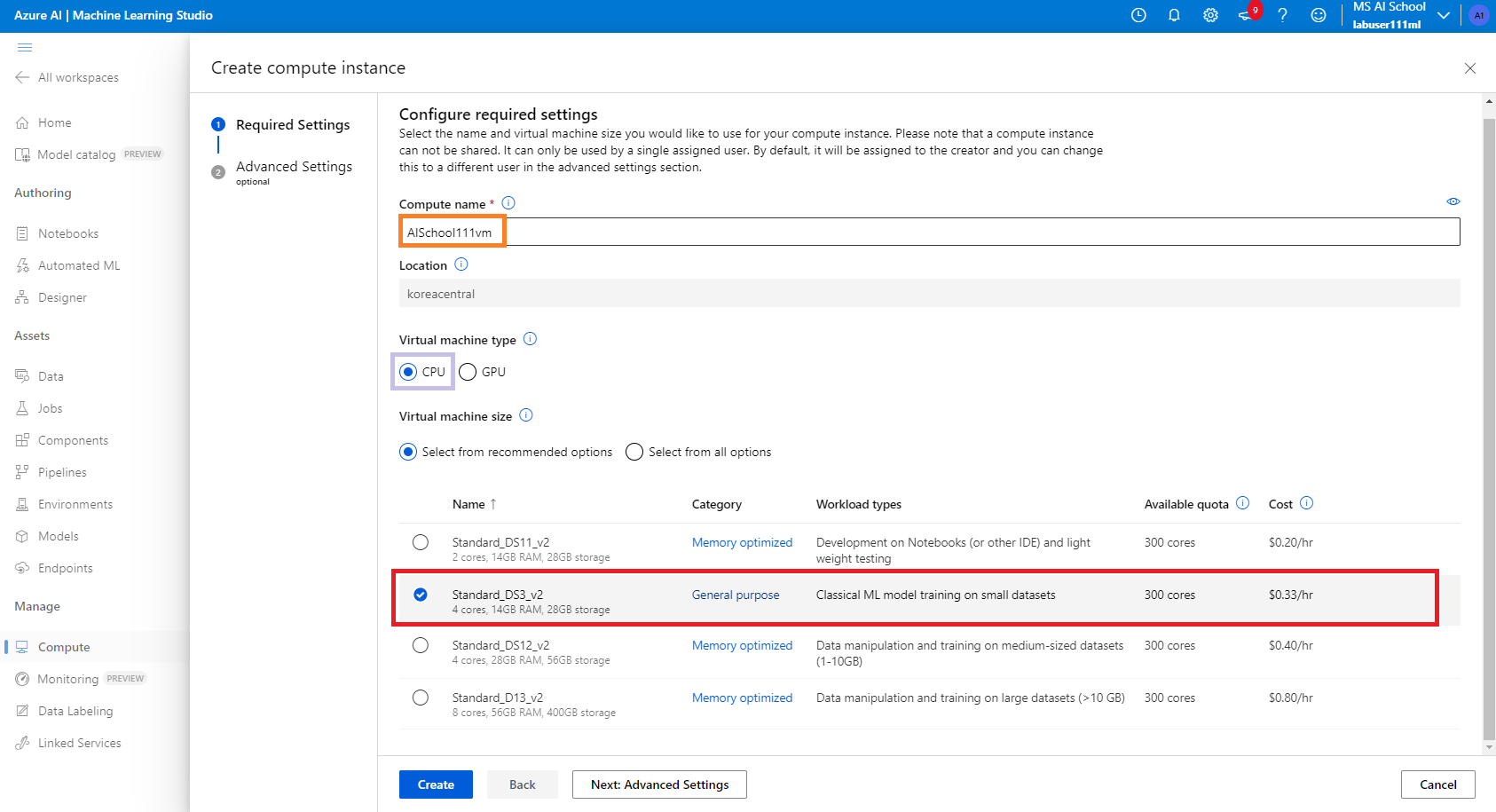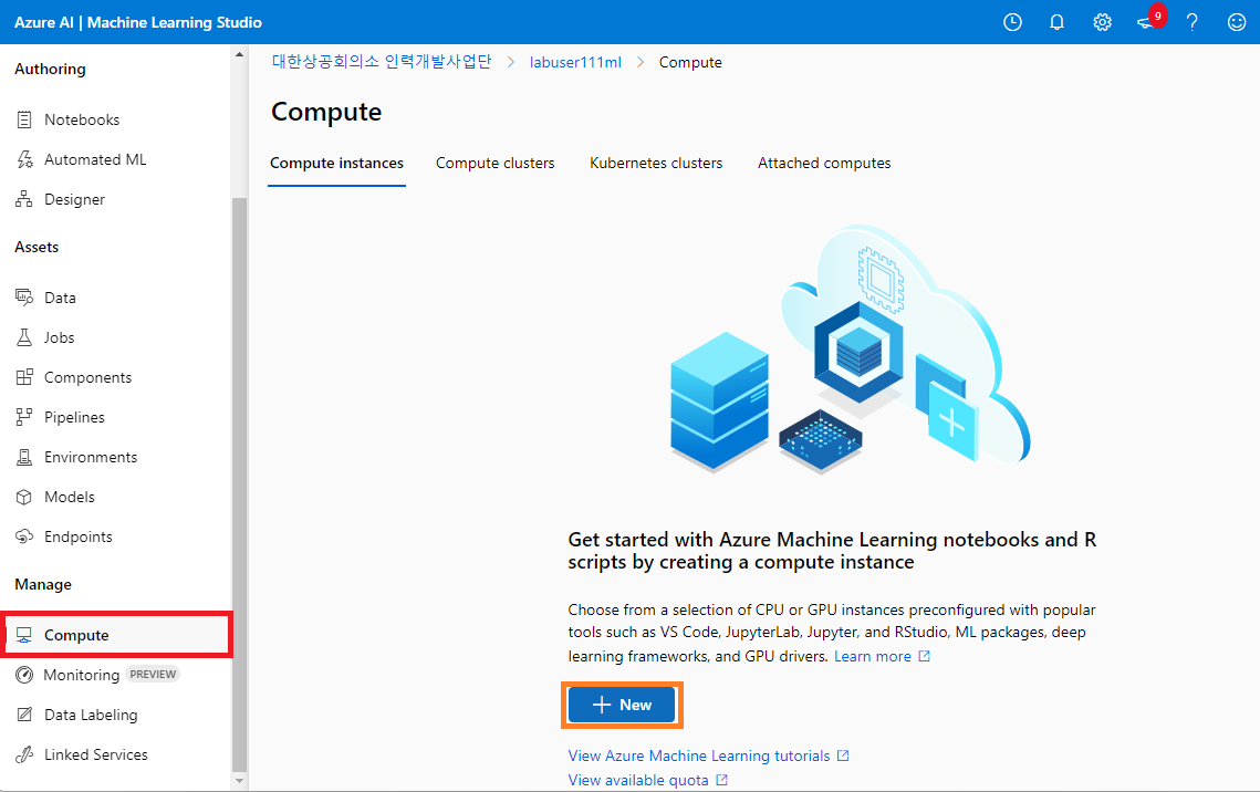 Azure Machine Learning Studio 페이지에서 가상 머신 생성하기