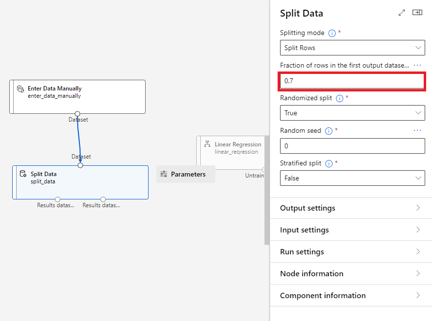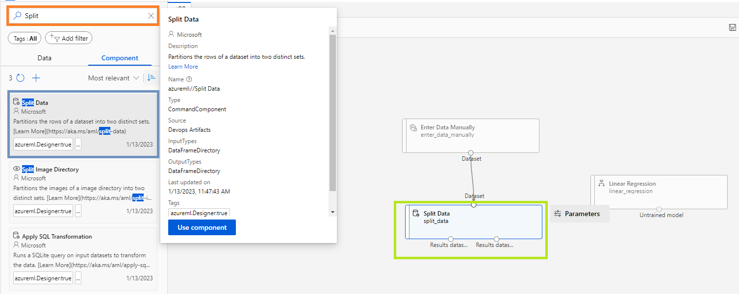 - 그리고 컴포넌트 검색창에 @[Split]@을 검색하여 @[Split Data]@ 컴포넌트를 끌어온다. 그리고 @[Enter Data Manually]@ 컴포넌트의 데이터셋(Dataset)을 @[Split Data]@ 컴포넌트의 상단에 연결해준다. @[Split Data]@ 컴포넌트의 왼쪽 Output은 학습용 데이터로 사용하고, 오른쪽 Output은 테스트용 데이터로 사용하게끔 하면 된다.