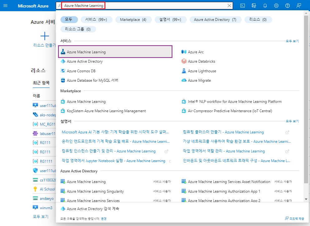 - 애저 포털의 검색창에 @Azure Machine Learning@을 검색한 후 @[Azure Machine Learning]@ 서비스로 진입한다.