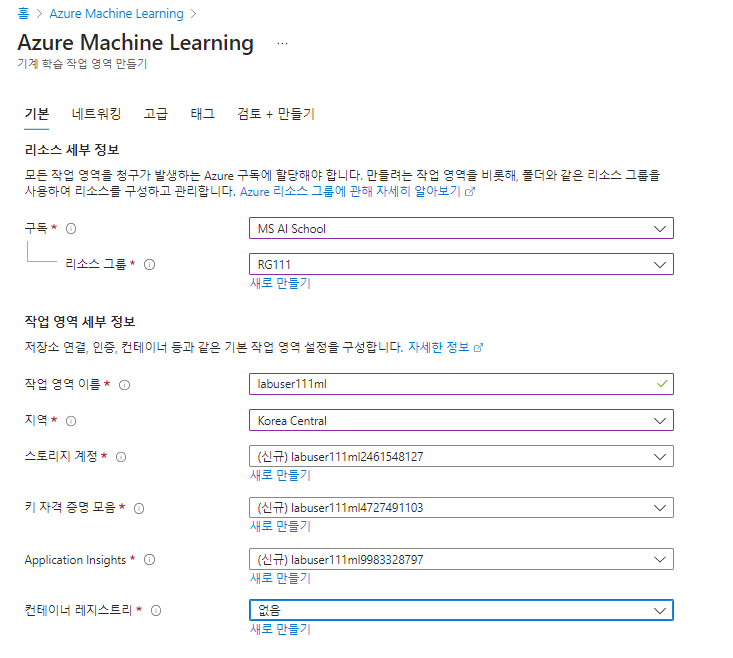 - @[Azure Machine Learning]@ 페이지에서 @[만들기]@ 버튼을 클릭하여 리소스를 만들어준다.