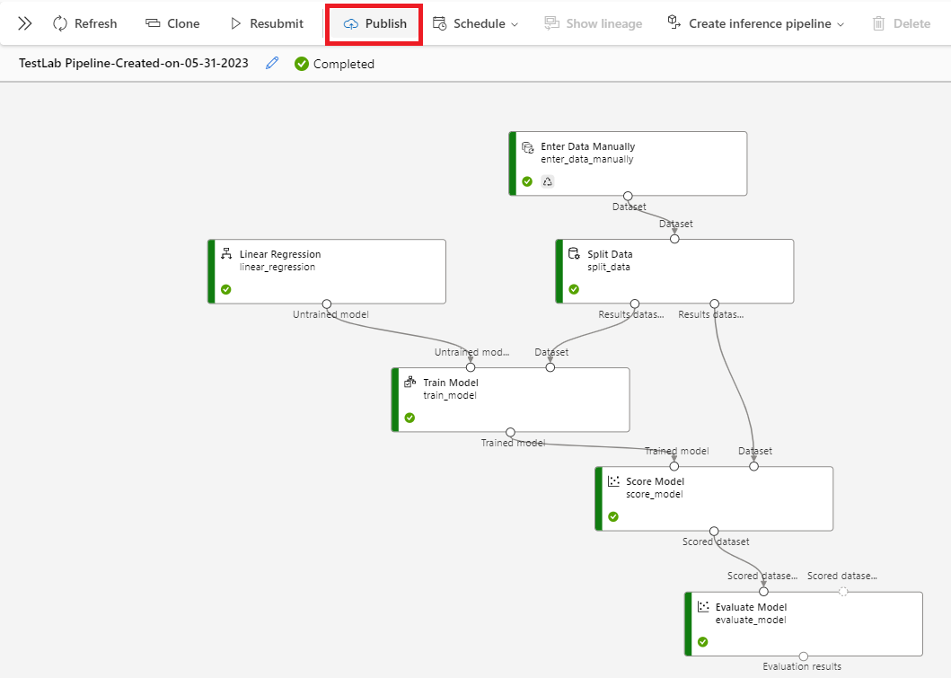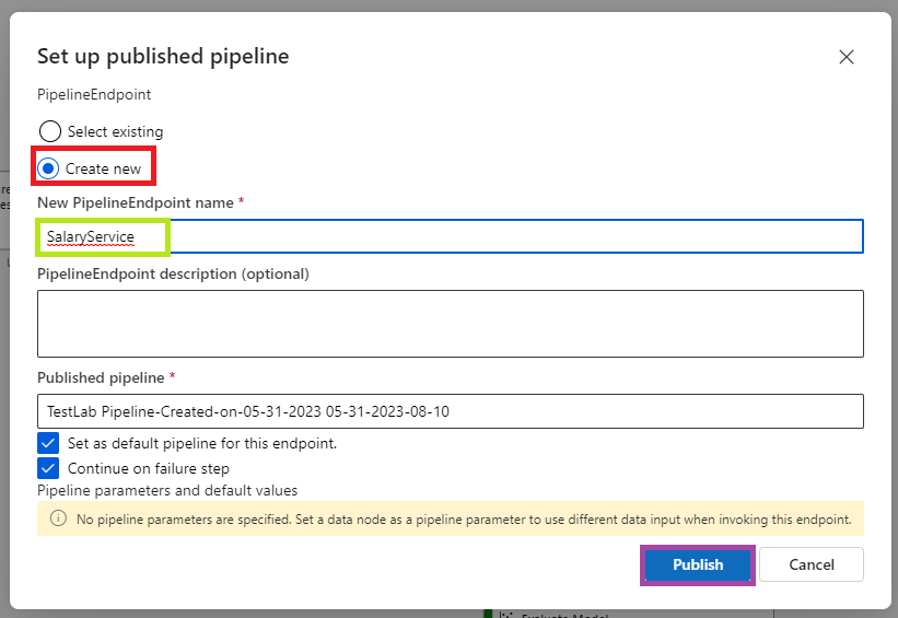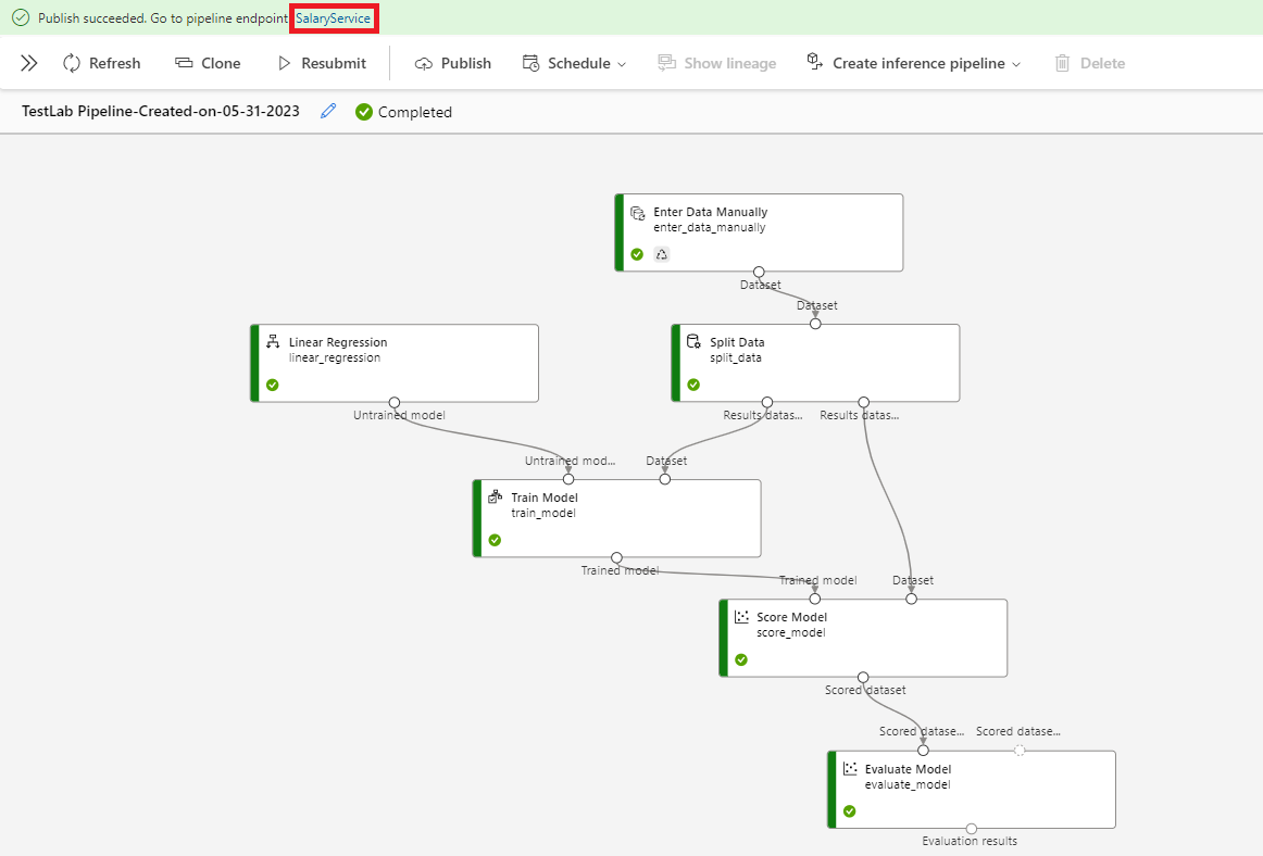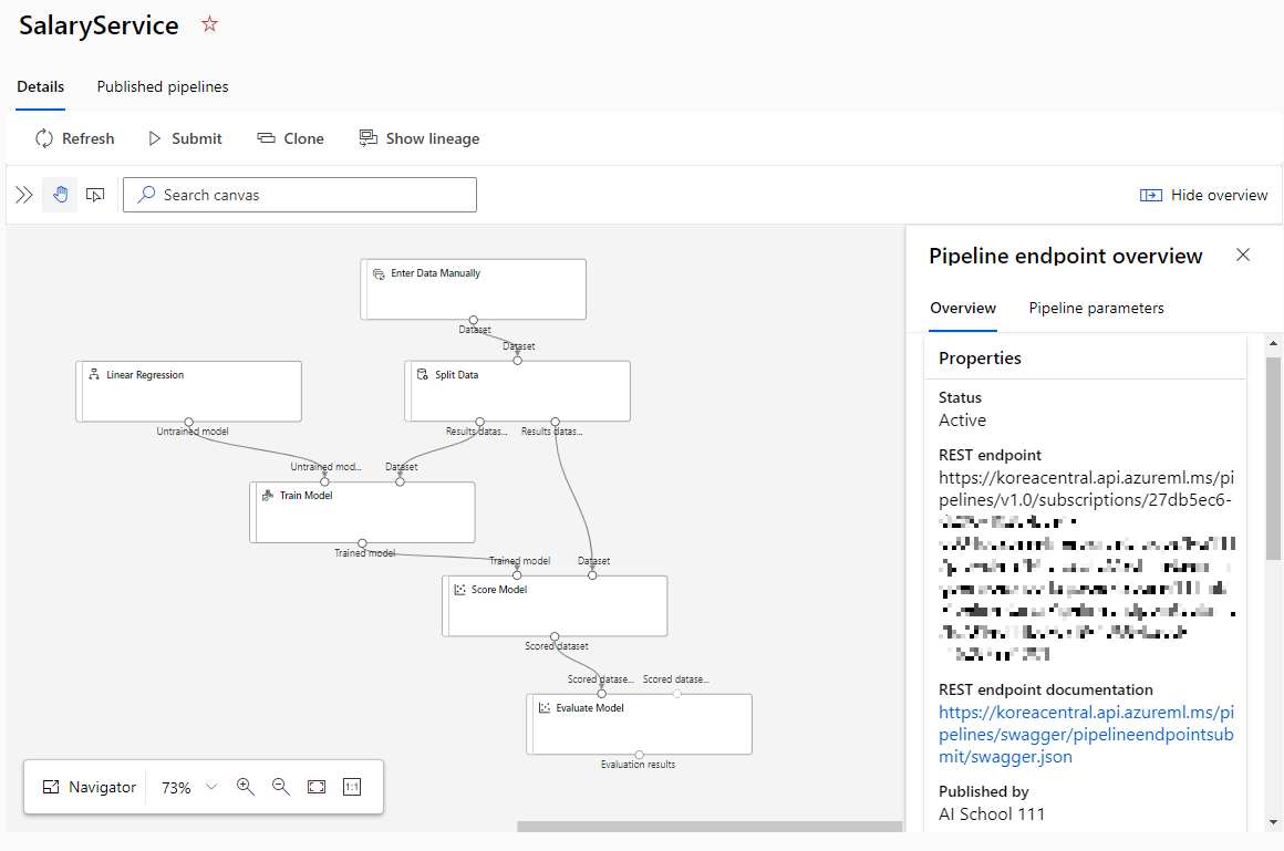 - 이로써 근속 연수에 따른 연봉 예측 모델이 만들어졌다. 이제 이 모델을 배포해보자. 상단의 @[Publish]@ 버튼을 클릭한 후, @[PipelineEndpoint@ 옵션을 @[Create new]@로 설정한 후, @PipelineEndpoint@ 이름을 지정해준다. 그리고 @[Publish]@ 버튼을 클릭한다. 배포가 완료되면 상단의 알림창에서 본인이 지정한 PipelineEndpoint 이름(@SalaryService@)의 링크를 클릭한다. 그러면 접속에 필요한 엔드포인트(Endpoint)를 확인할 수 있다.
