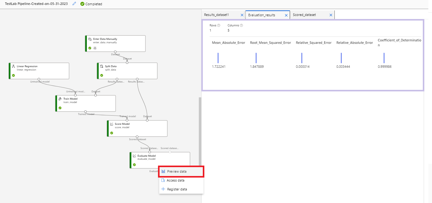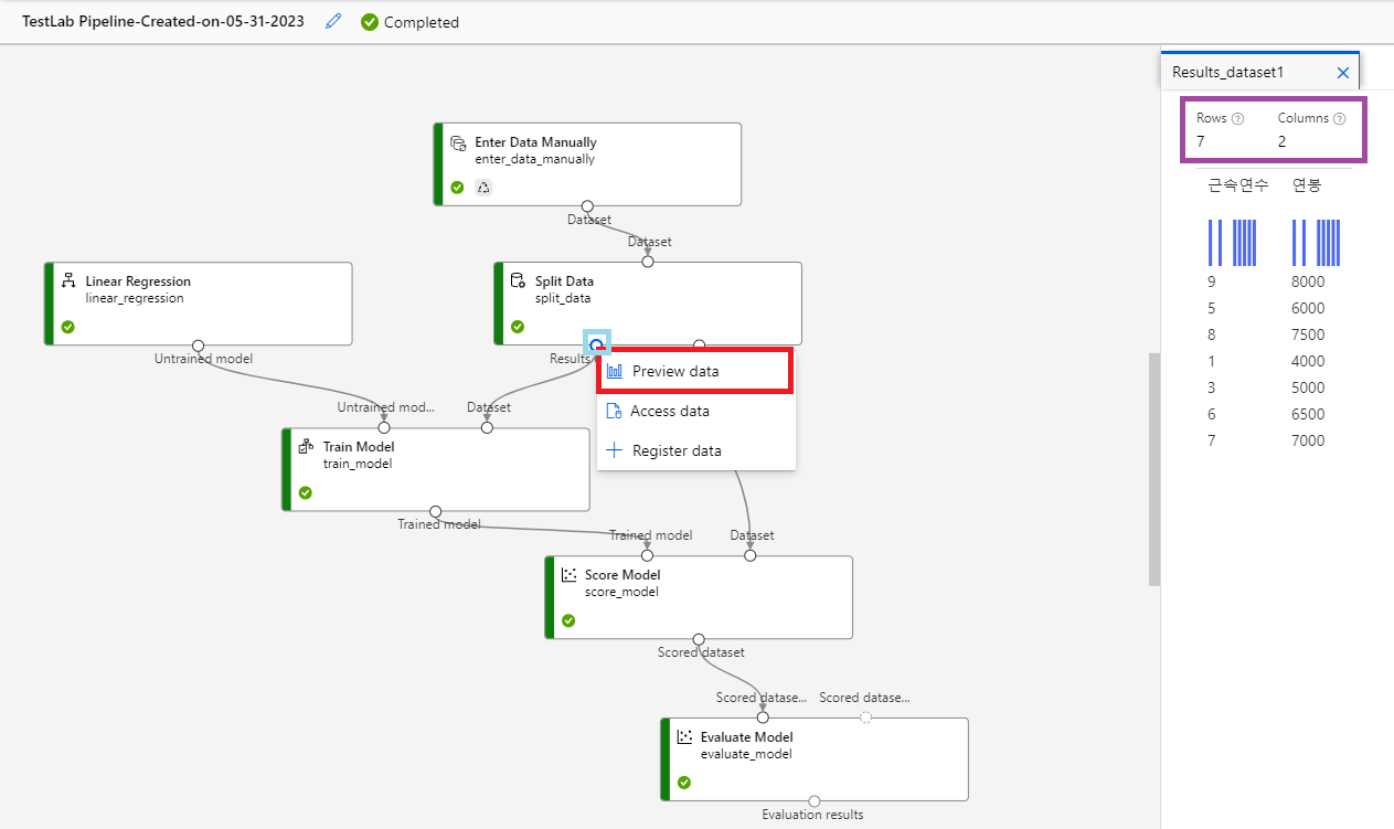 - 똑같이 @[Evaluate Model]@ 컴포넌트의 @o@ 아이콘에 마우스 커서를 올리고, 마우스 오른쪽 버튼을 눌러서 @[Preview data]@를 클릭해본다.