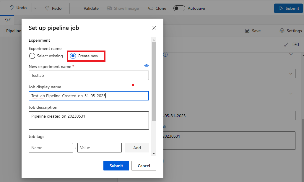 - @[Experiment name]@을 @Create new@로 설정한 후 @[Submit]@ 버튼을 클릭한다. 왼쪽에 성공적으로 Submitted 되었다는 메시지를 확인할 수 있다. 그리고 메시지의 @[Job detail]@ 링크를 클릭한다.