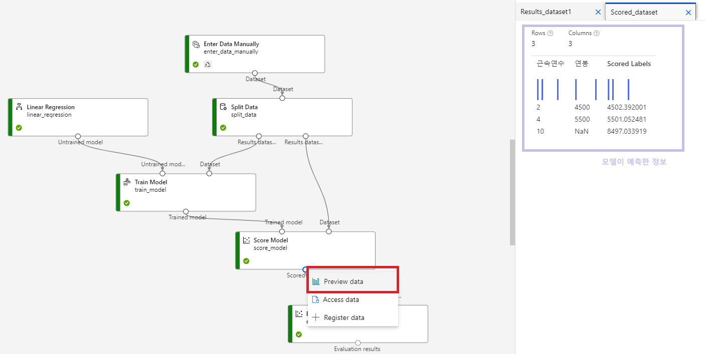 - 똑같이 @[Score Model]@ 컴포넌트의 @o@ 아이콘에 마우스 커서를 올리고, 마우스 오른쪽 버튼을 눌러서 @[Preview data]@를 클릭해본다. 모델이 예측한 정보를 확인할 수 있다.