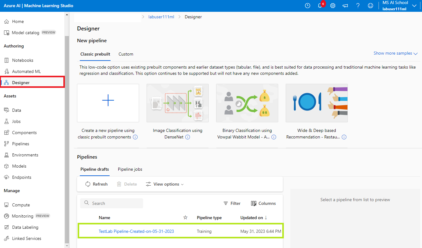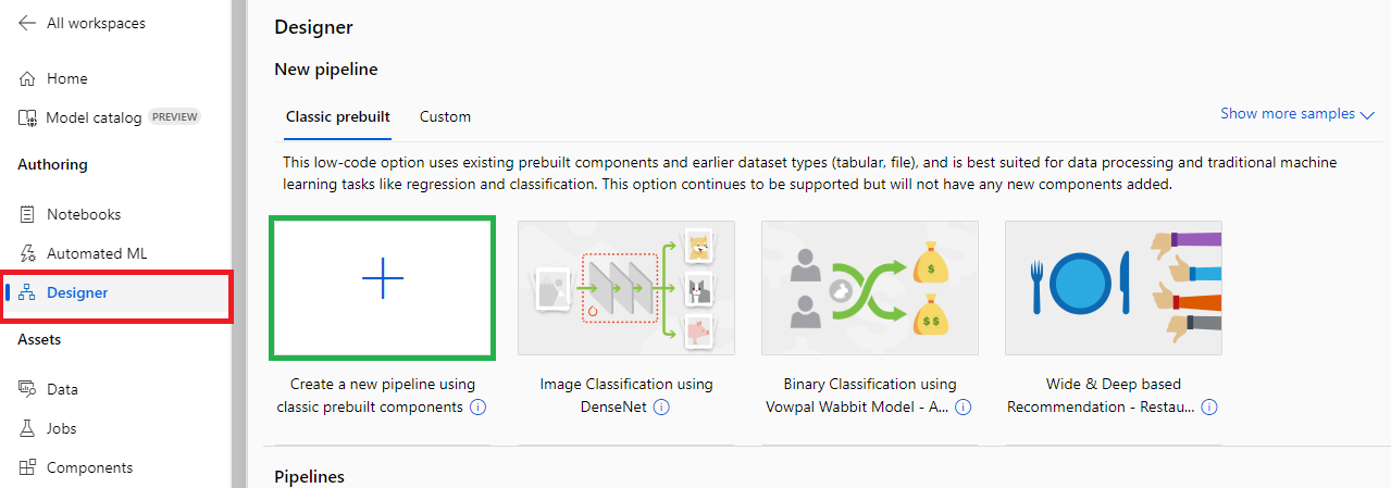 - 가상 머신이 생성되면, 왼쪽의 @[Designer]@ 탭을 클릭한 후, @[Create a new pipeline using classing prebuilt components]@를 클릭한다.
