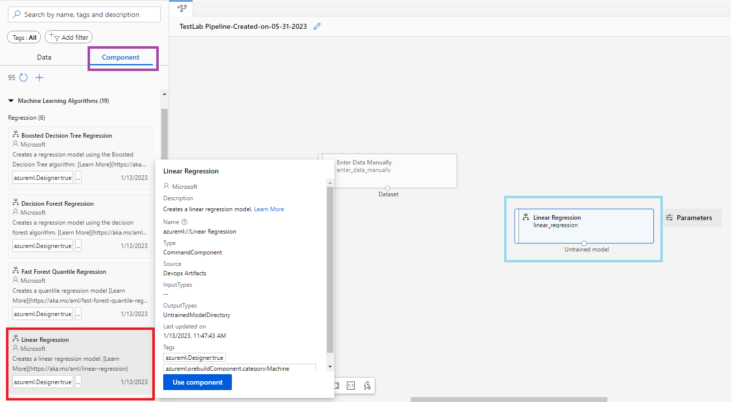 - @[Component]@ 탭 > @[Machine Learning Algorithms]@ 섹션에서 @[Linear Regression]@ 컴포넌트를 끌어온다.