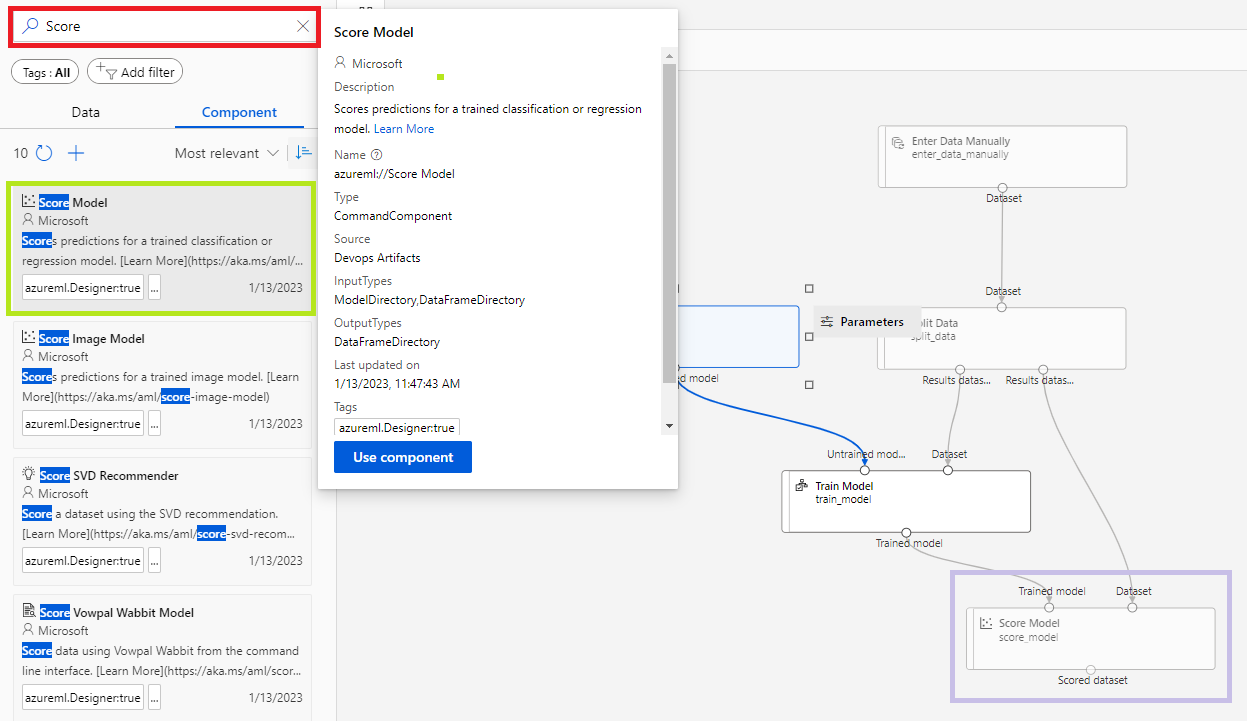 - 컴포넌트 검색창에 @[Score]@을 검색한 후, @[Score Model]@ 컴포넌트를 끌어온다. 그리고 아래 그림처럼 @[Split Data]@ 컴포넌트와 @[Train Model]@ 컴포넌트를 @[Score Model]@ 컴포넌트에 연결해준다. (@[Split Data]@ 모델의 오른쪽 데이터셋(테스트 데이터셋)을 @[Score Model]@ 컴포넌트의 입력으로 주어, @[Split Data]@ 모델의 왼쪽 데이터셋(훈련용 데이터셋)을 Linear Regression으로 훈련한 모델을 검증해보는 작업이다.)
