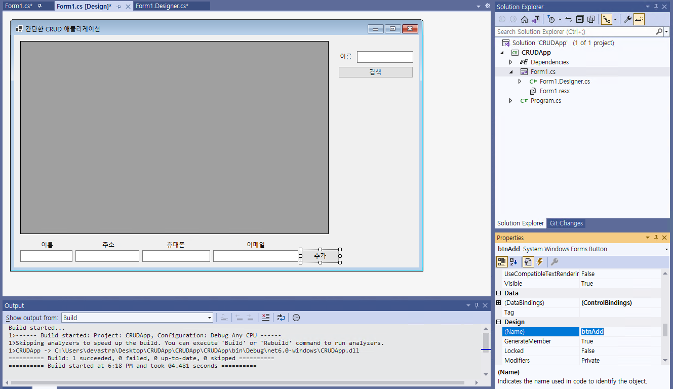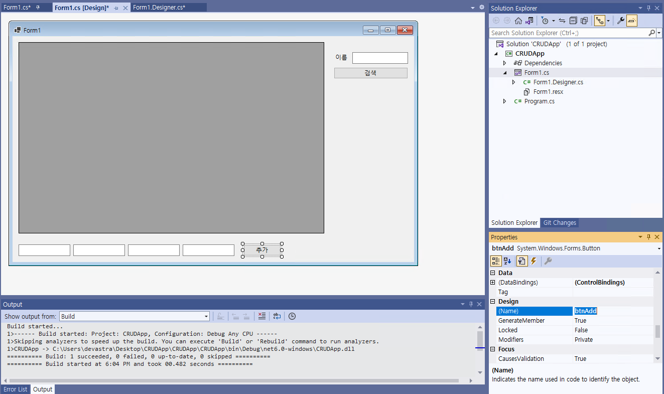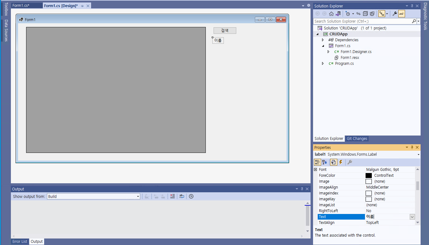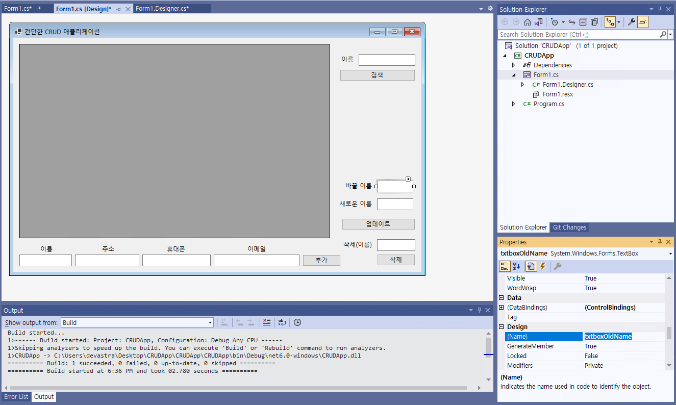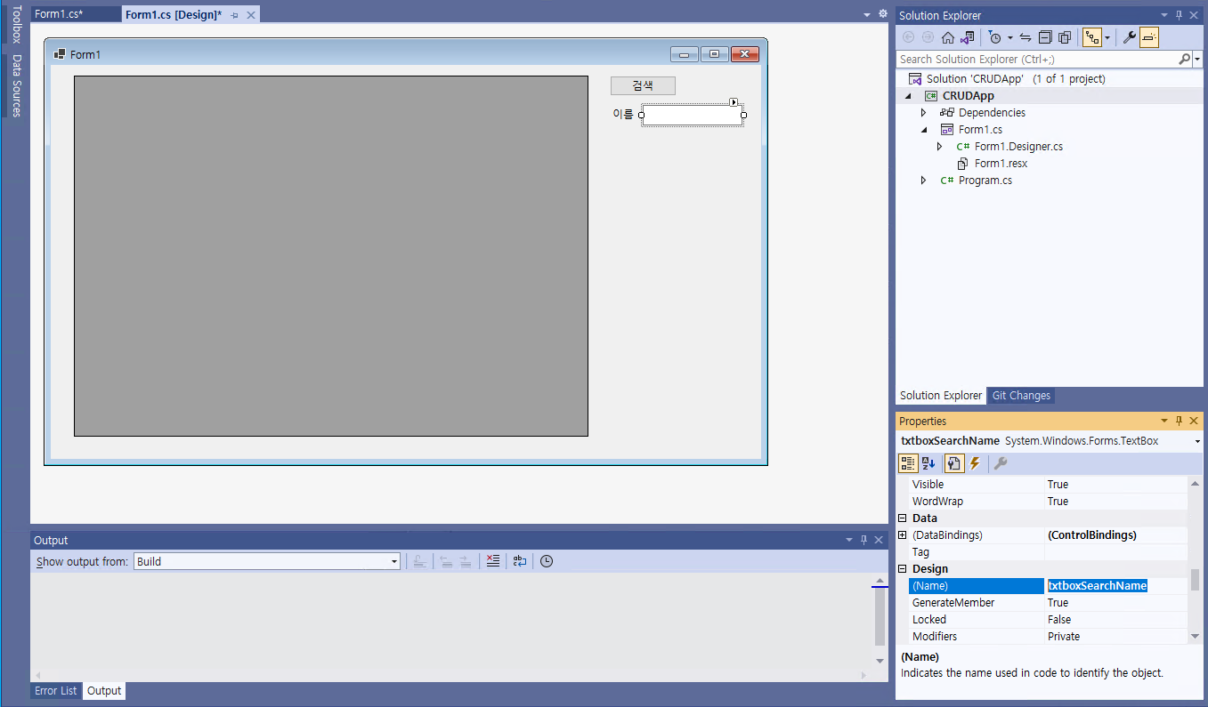 - 그 다음, 텍스트 박스를 추가한 후, @[(Name)]@을 @txtboxSearchName@으로 지정해준다. 그리고 약간의 UI를 변경해본다.