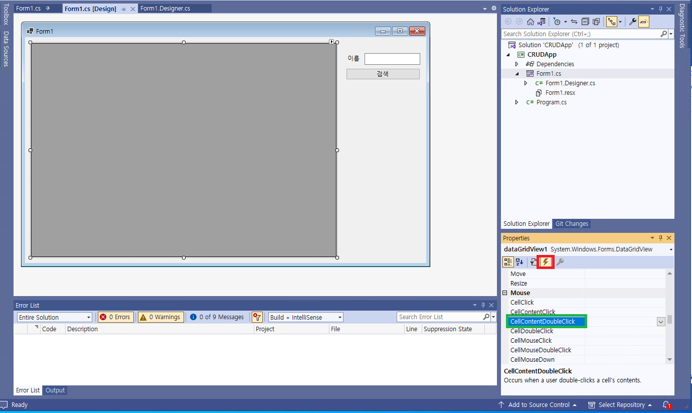 - 그리드 뷰를 클릭한 후, 좌측의 @[Properties]@ 창에서 번개 모양 아이콘을 클릭한다. 그리고 @CellContentDoubleClick@ 이벤트를 찾는다. 그리고 더블 클릭하여, 다음 코드를 넣는다.