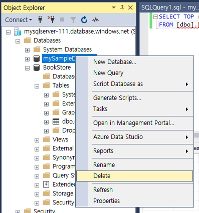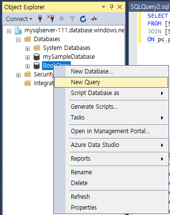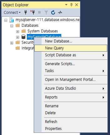 - 개체 탐색기에서 @mySampleDatabase@를 마우스 오른쪽 버튼으로 클릭한 후, @[새 쿼리(New Query)]@를 선택한다. 데이터베이스에 연결된 새 쿼리 창이 열린다.