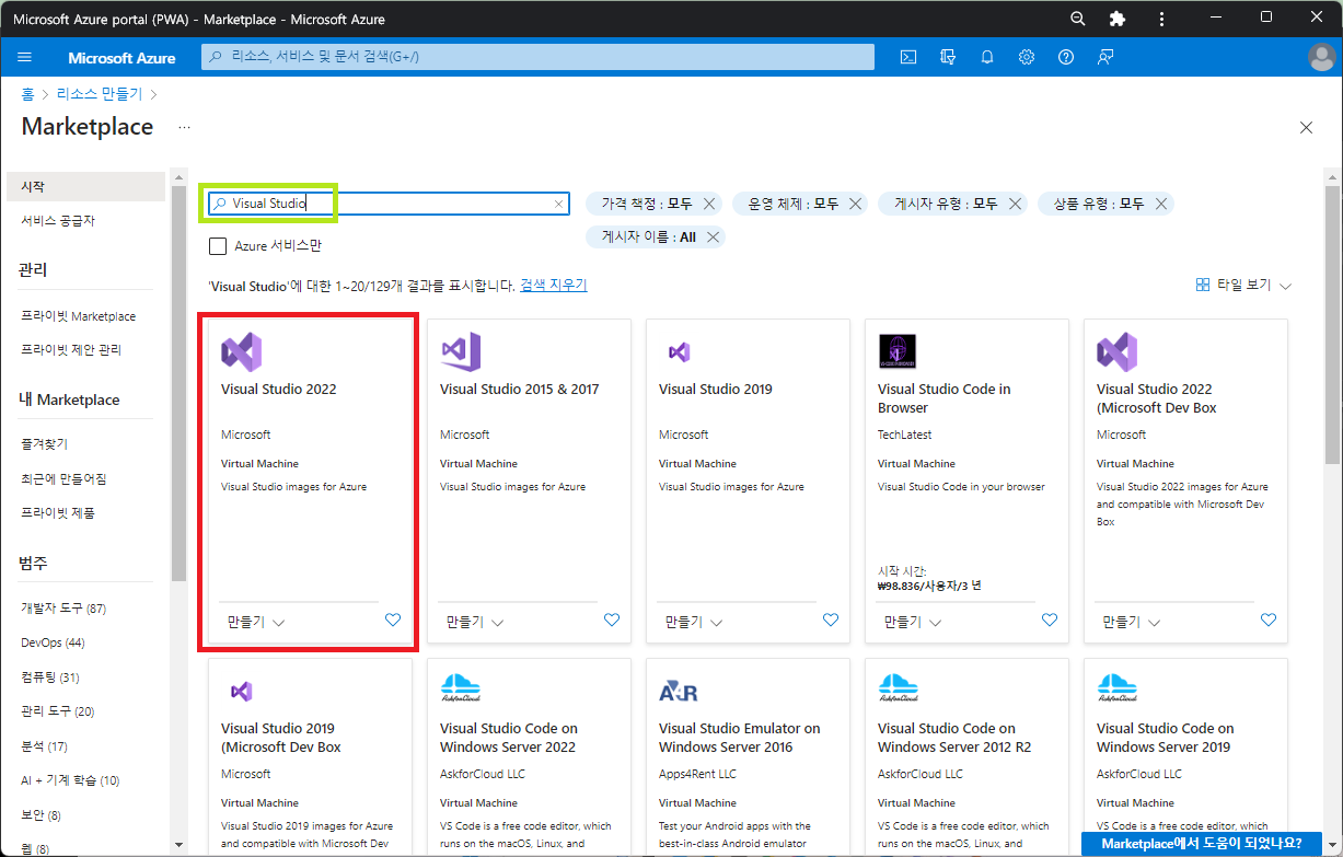 - 애저(Azure) 포털의 Marketplace에서 @Visual Studio@를 검색한 후, 리소스를 생성해준다.