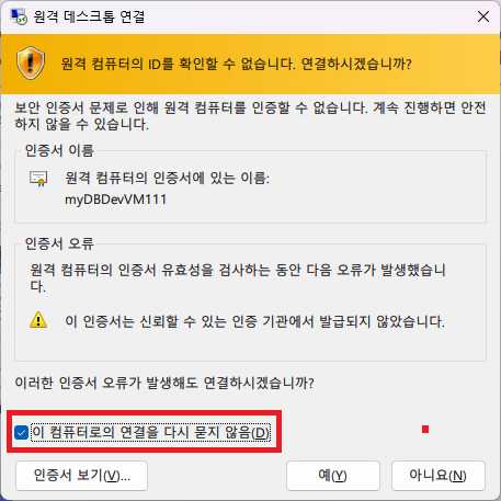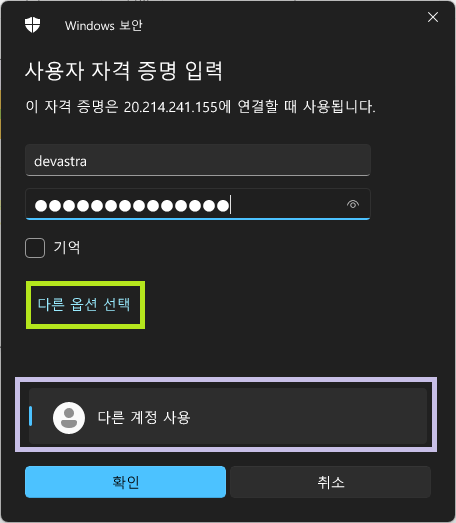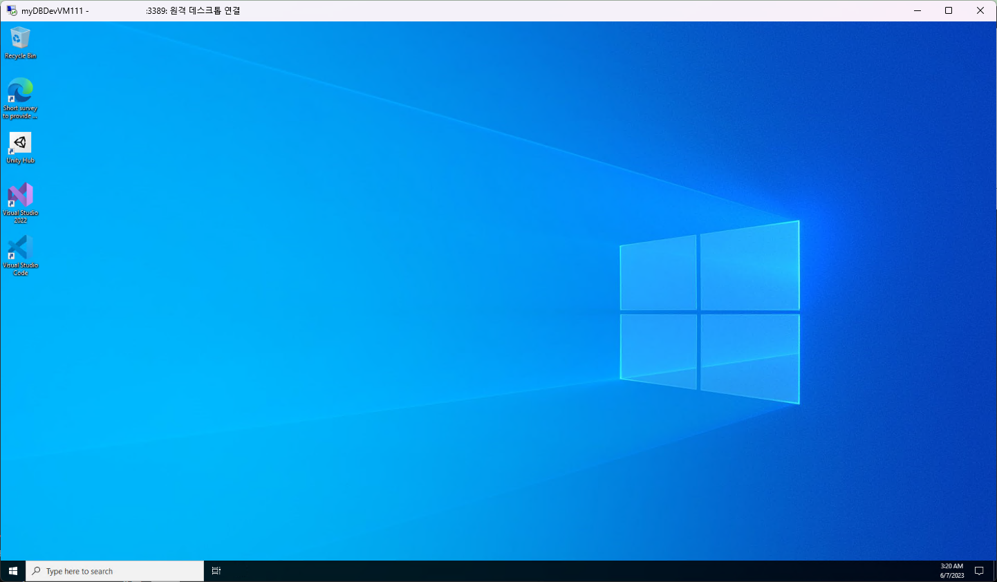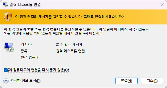 - 다운로드 받은 RDP 파일을 실행하여 원격 접속을 실행한다. Visual Studio 2022가 설치된 Windows Server 가상 머신으로 접속하게 된다.