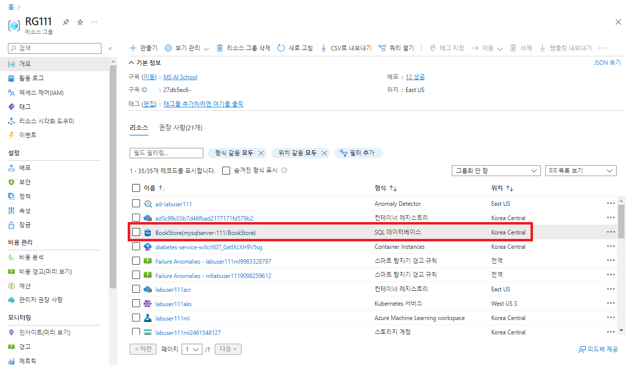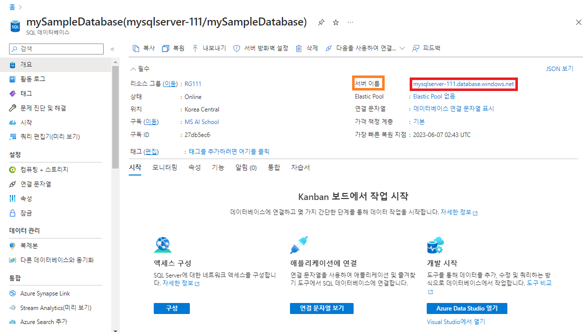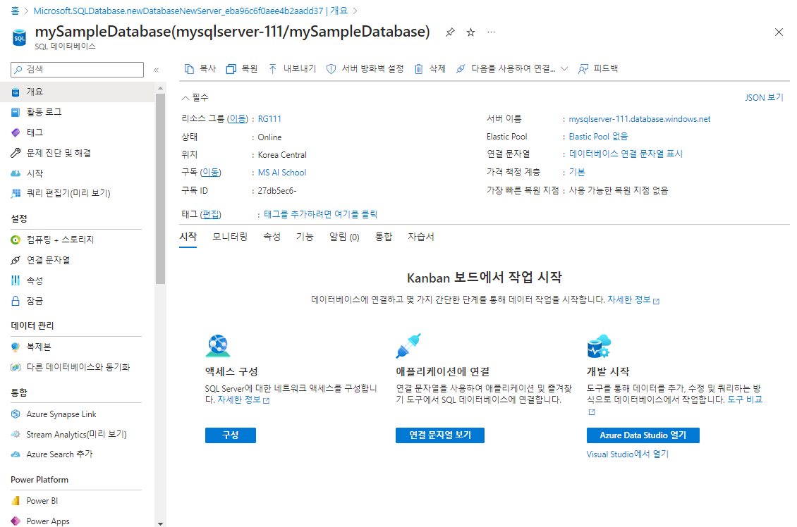 - SQL 데이터베이스 배포를 완료하였다. 데이터베이스 이름은 @mySampleDatabase@, 서버 이름은 @mysqlserver-111@로 설정하였다.