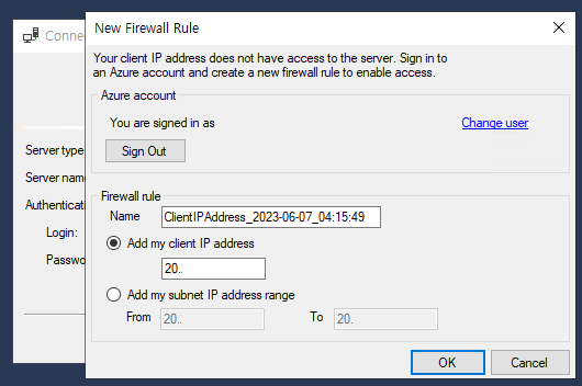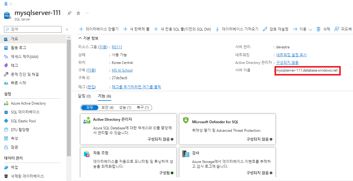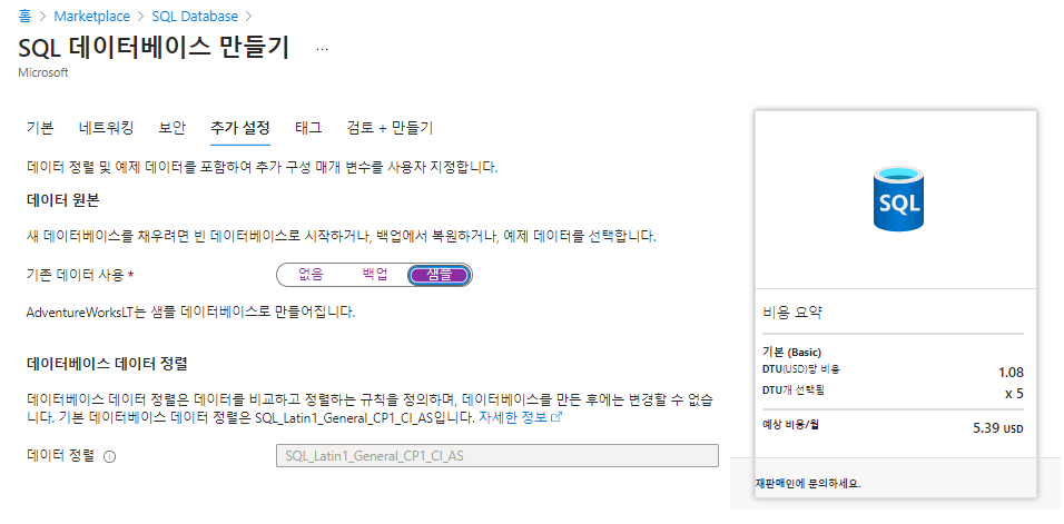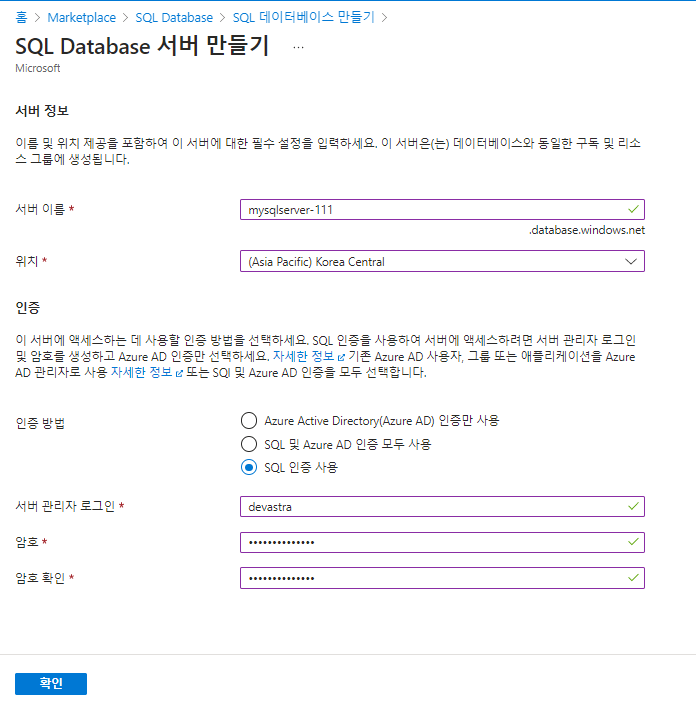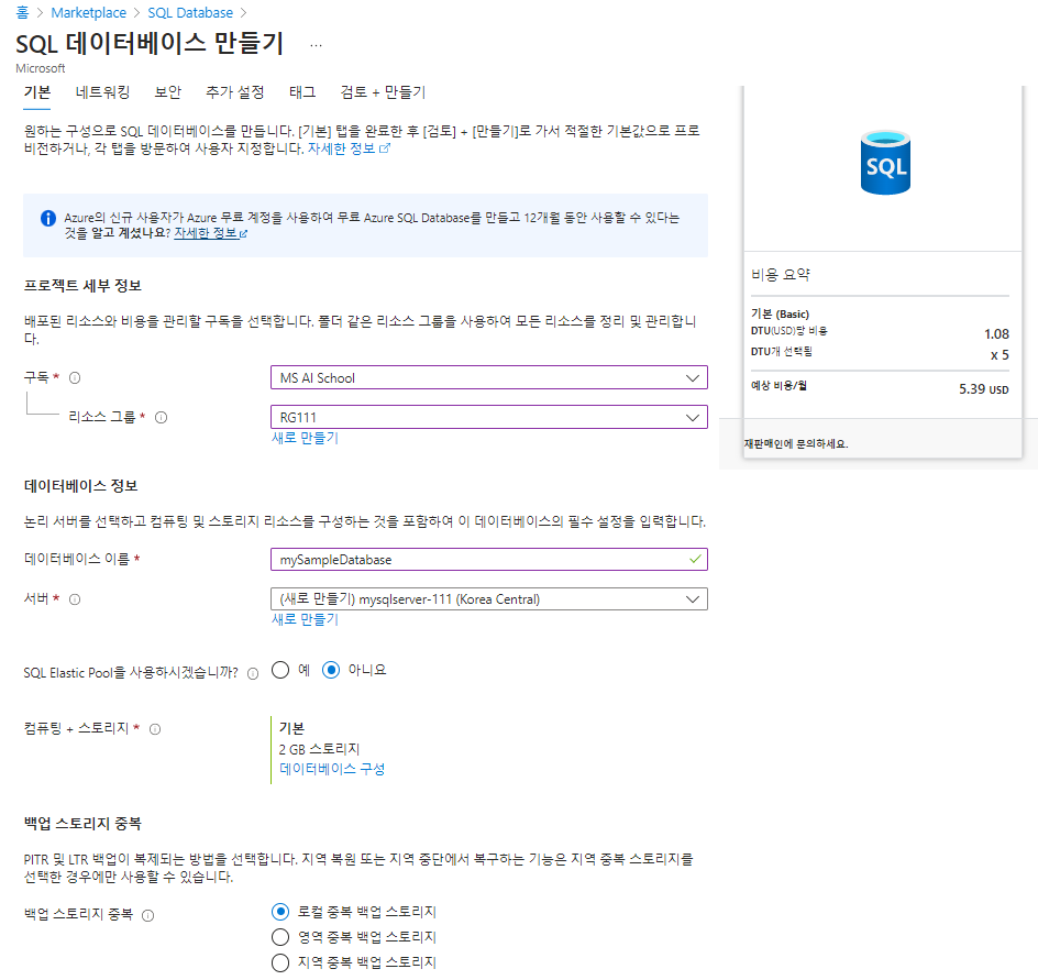 - 지역 : 애저에서 SQL Database 서비스를 배포한 지역과 동일하게 설정해준다.