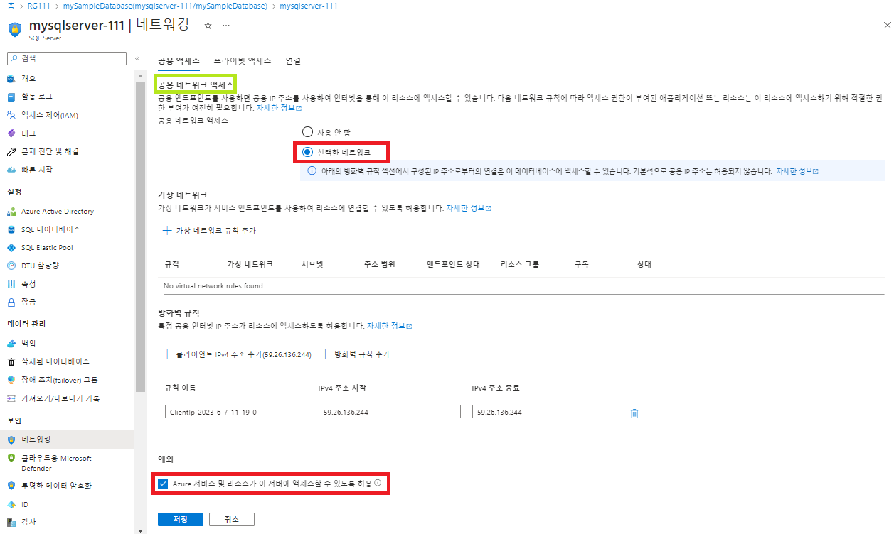 - @[공용 네트워크 액세스]@가 사용되고 있는지 확인하고, 밑의 @[예외]@ 섹션에 있는 @[Azure 서비스 및 리소스가 이 서버에 액세스할 수 있도록 허용]@ 체크 박스를 체크한다.