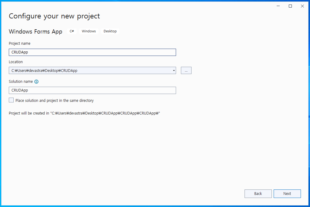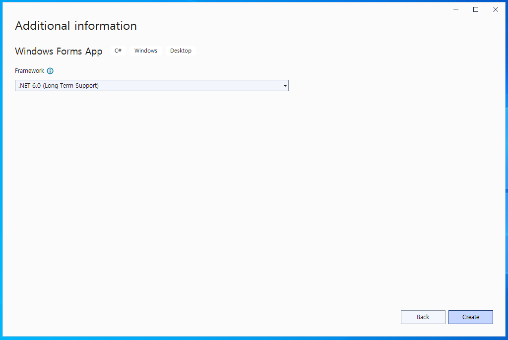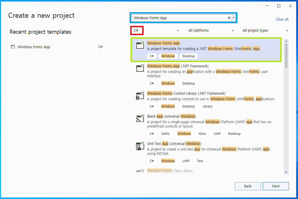 - @[Languages]@는 @C#@을 선택해주고, 검색창에 @Windows Forms App@을 검색한 후 해당 템플릿을 선택해준다.
