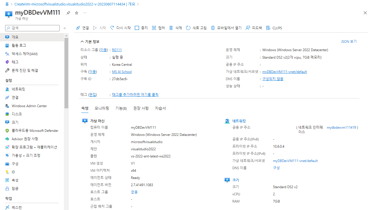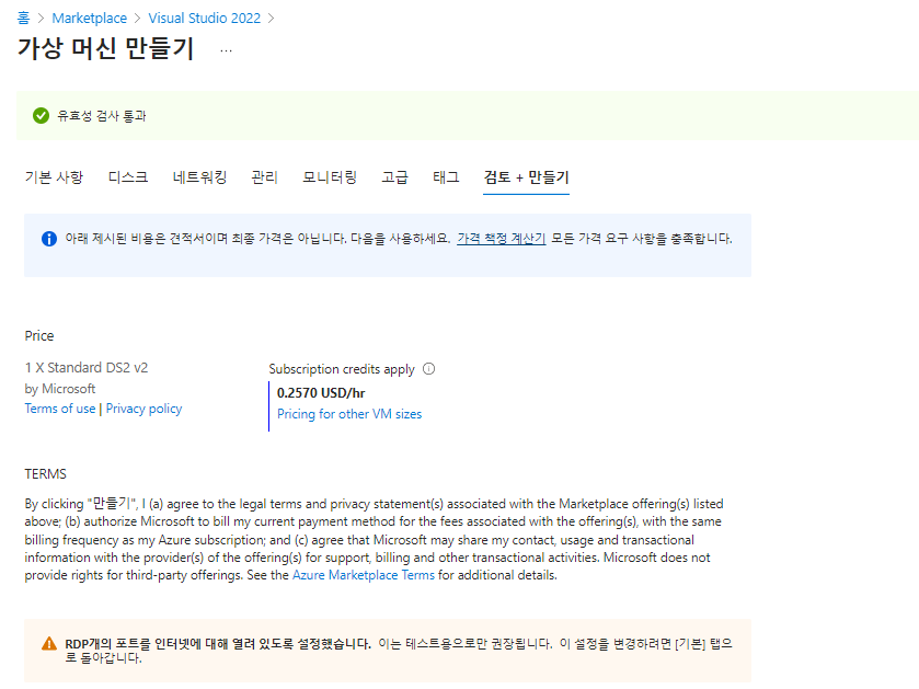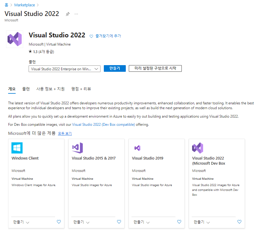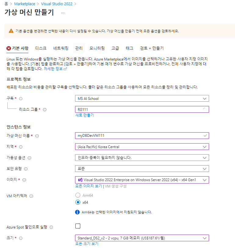 - 플랜 : Visual Studio 2022 Enterprise on Windows Server 2022 (x64) - x64v Gen1