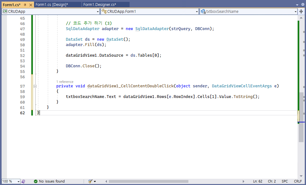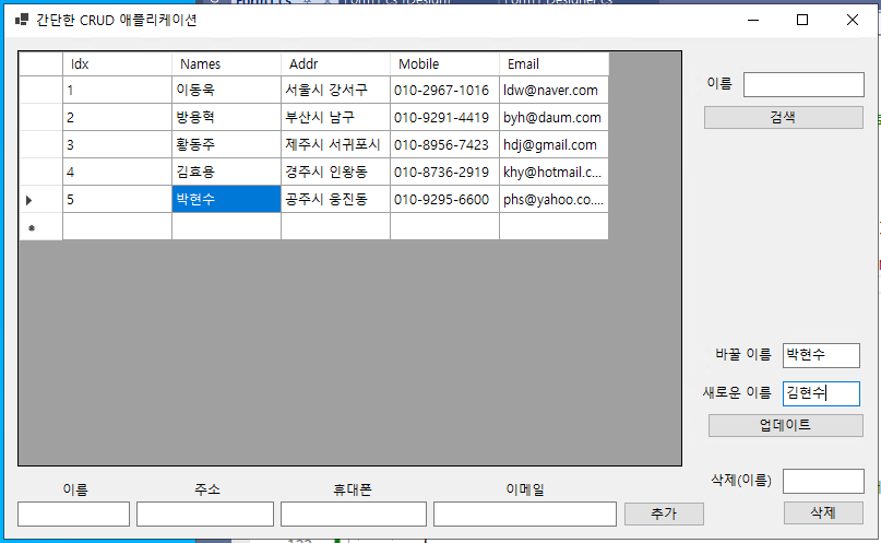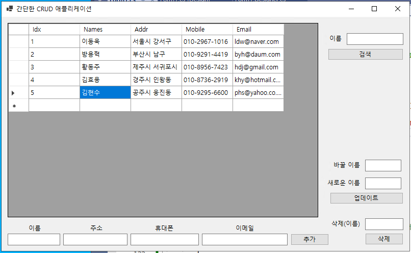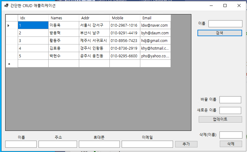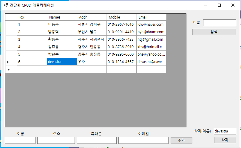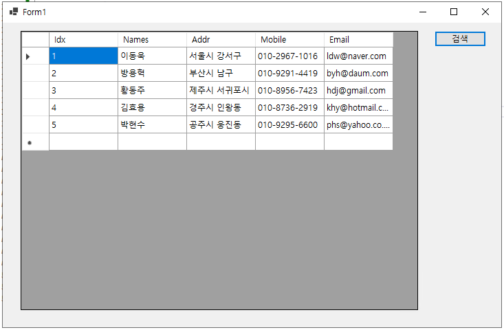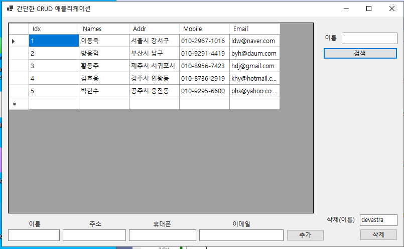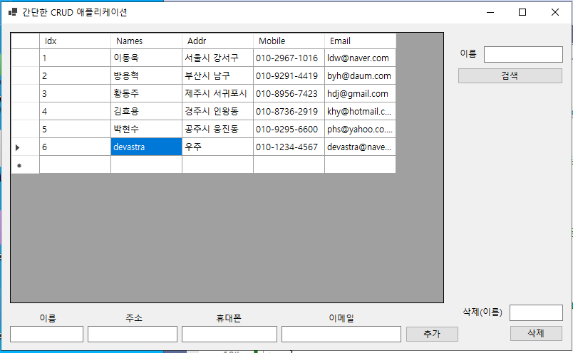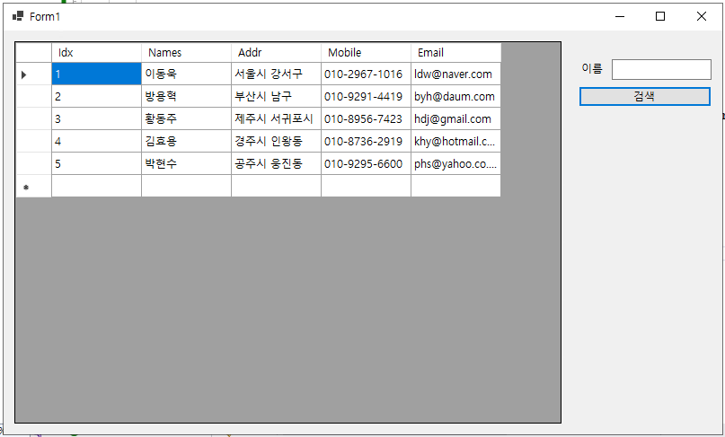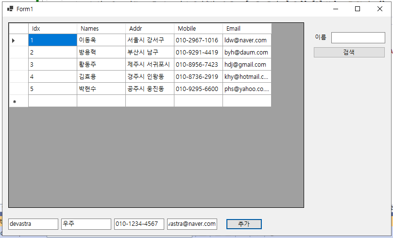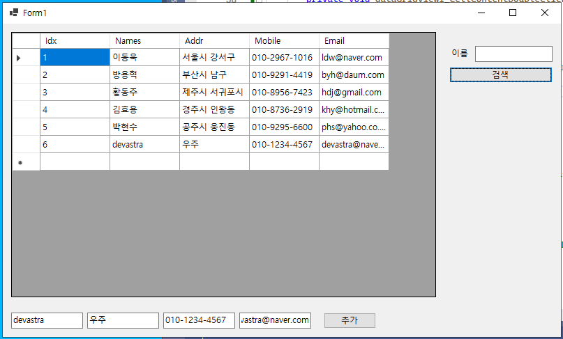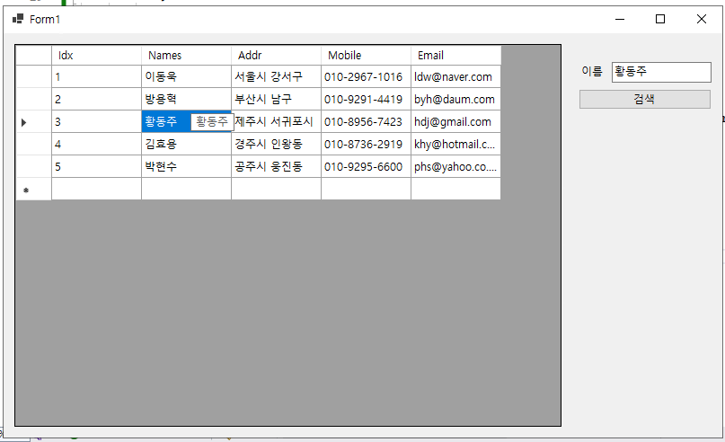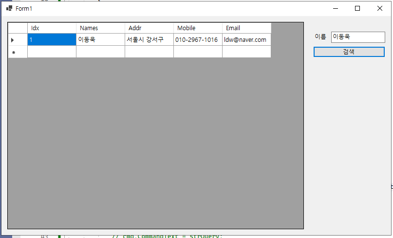 - 이제 그리드 뷰에 나타난 컬럼 항목에서 이름(@Name@)을 더블 클릭하면, 해당 컬럼의 이름(@Names@)이 텍스트 박스(@txtboxSearchName@)에 나타나게 되고, 특정 이름의 컬럼 항목만 검색할 수 있게 된다.