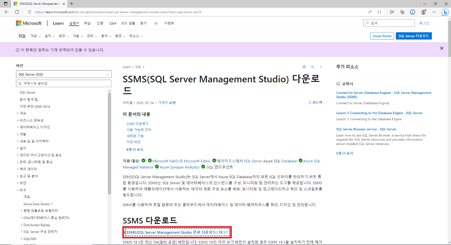최신 버전의 SSMS(SQL Server Management Studio)를 다운로드합니다.