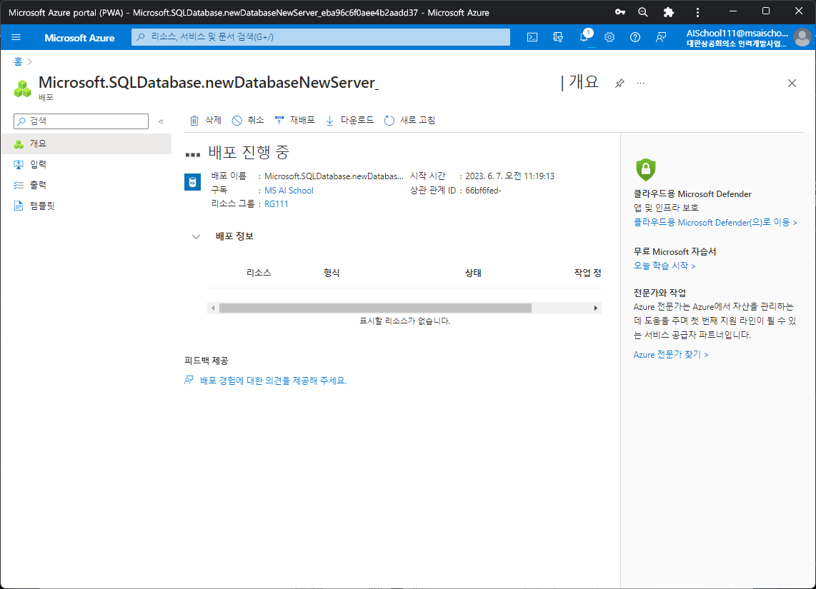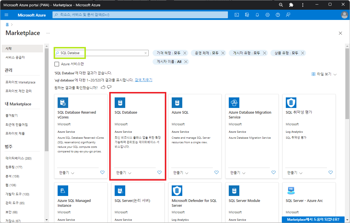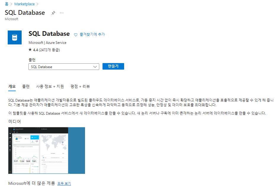 - 애저(Azure) 포털에서 SQL Database 서비스를 배포한다.