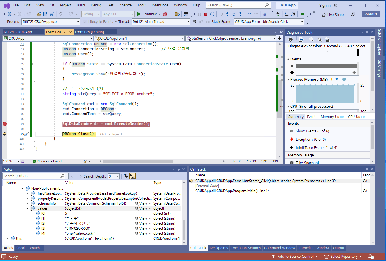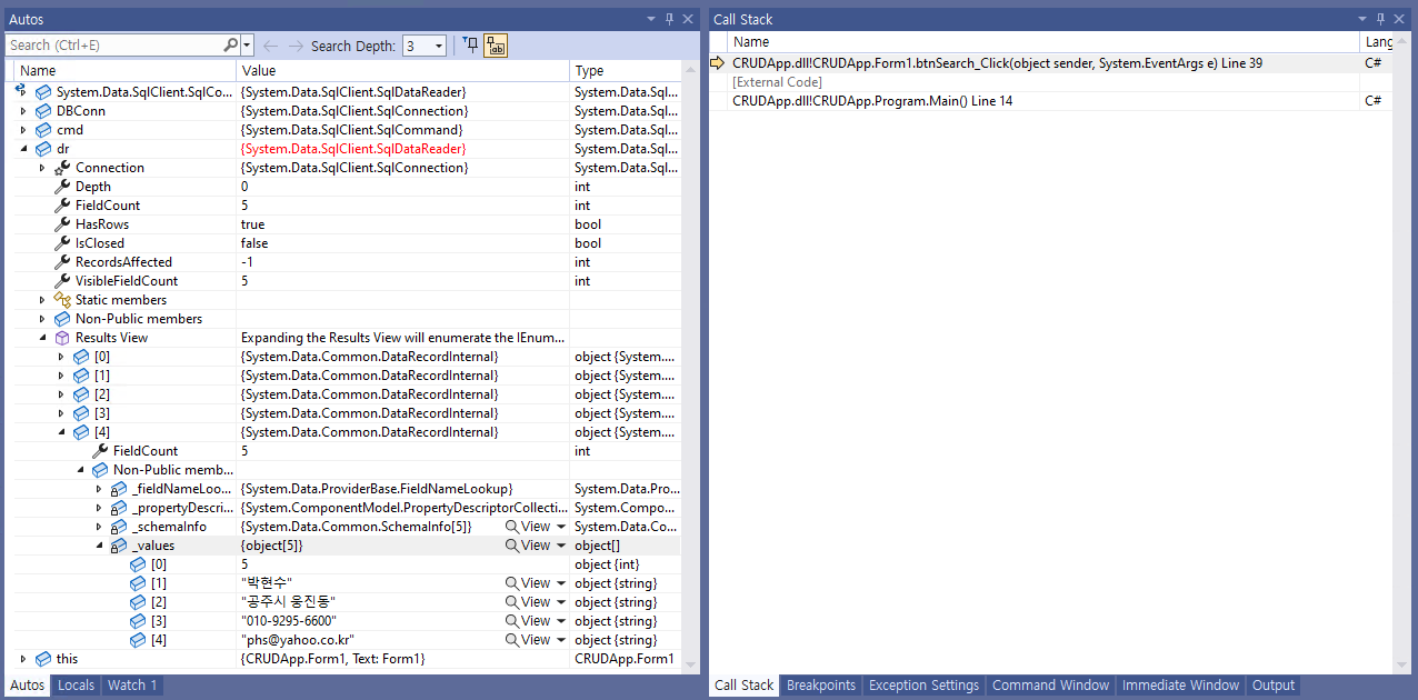 - 밑에 있는 @[Autos]@ 창에서 @dr@ 객체 > @[Result View]@ > @[0]@ ~ @[4]@ > @[Non-Public members]@ > @[_values]@에 진입한 후, 불러와진 값들을 확인해본다.