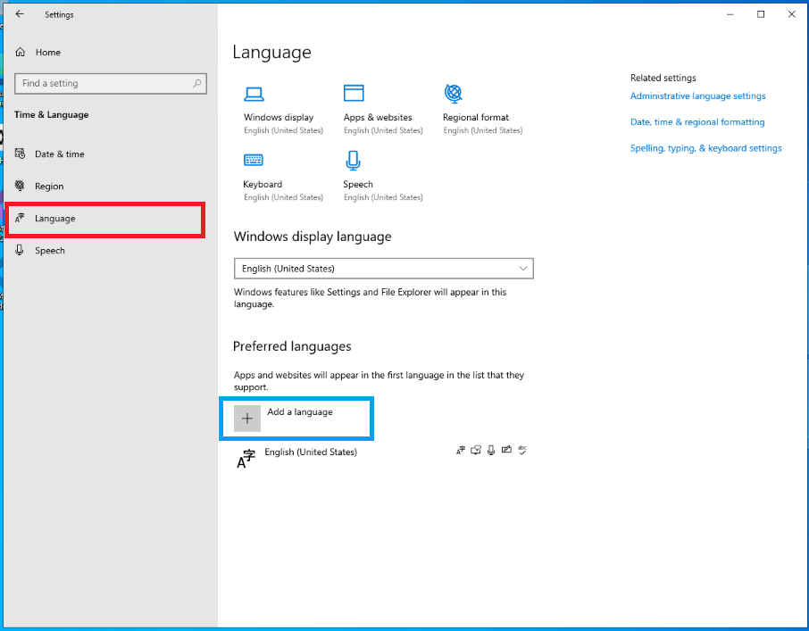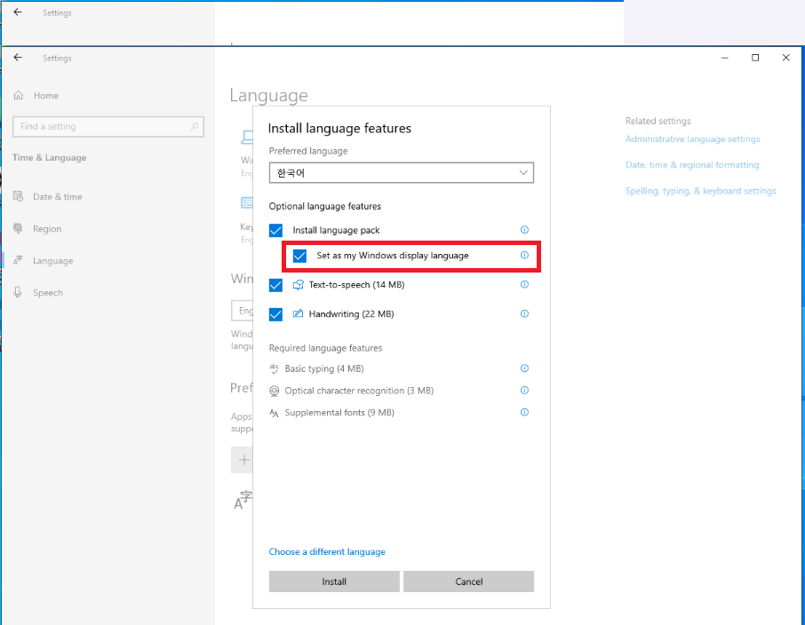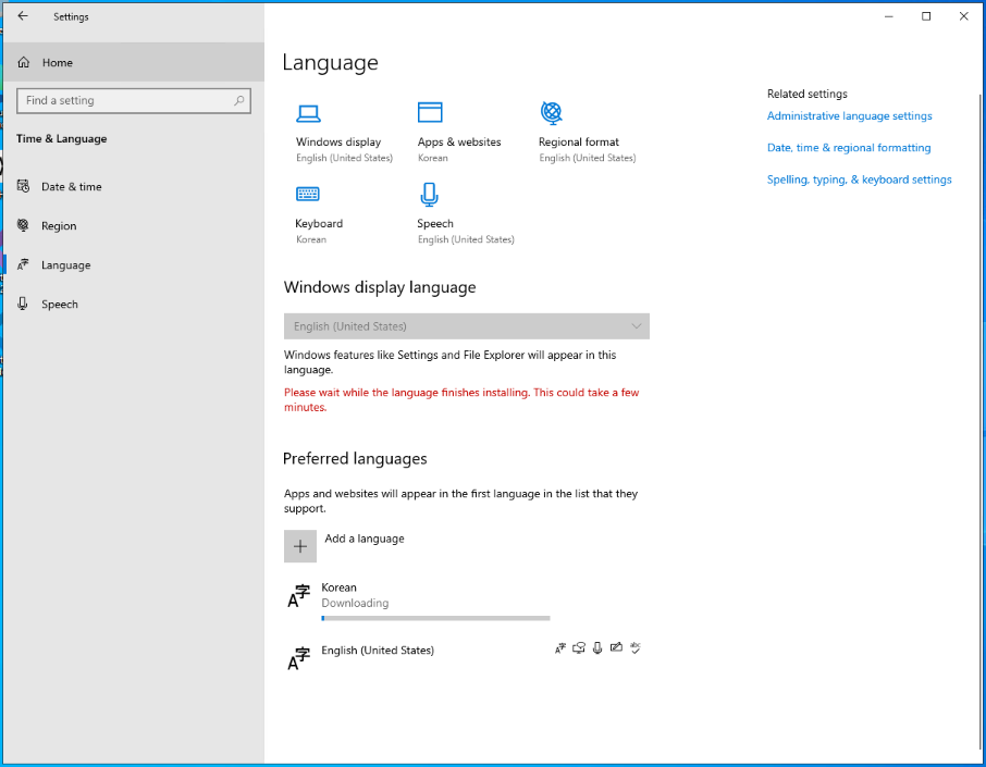 - 한글 언어팩 다운로드가 완료되면, @Windows display language@를 @한국어@로 설정해준다. 리부팅을 한 후, 다시 RDP 파일을 이용하여 원격 접속을 한다.
