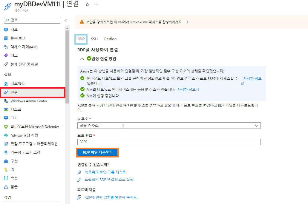 - 리소스를 생성하면, 로컬 PC에서 원격으로 접속하기 위해 RDP 파일을 다운로드 받는다.