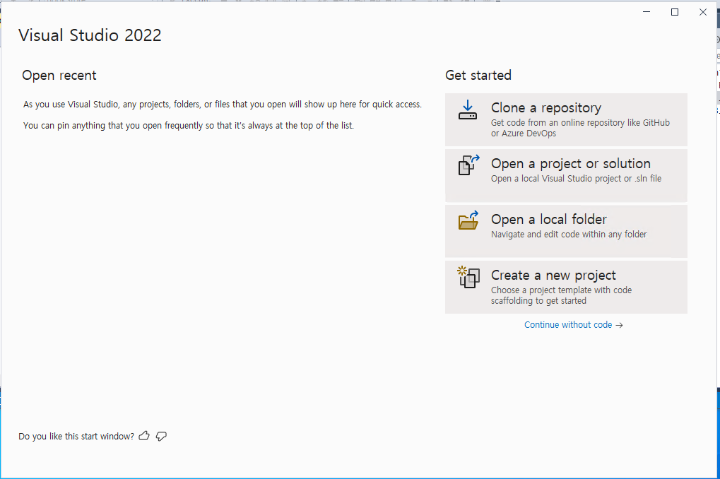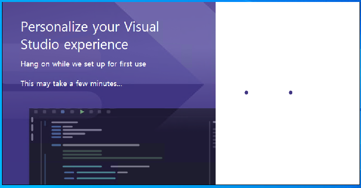 - 윈도우 VM에서 @Visual Studio 2022@ 프로그램을 실행한다. 처음 구성을 하는데 시간이 오래 걸릴 수 있다.