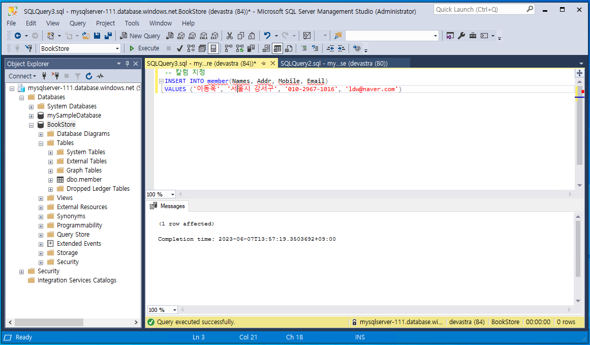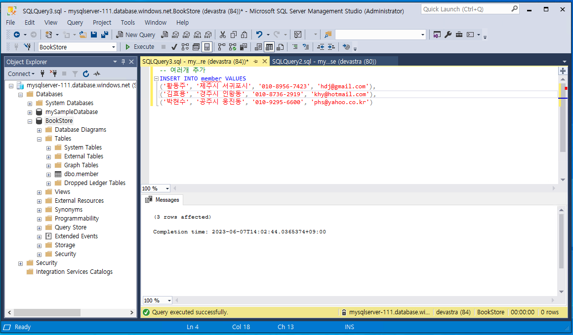 - 이제 새로 생성한 @BookStore@ 데이터베이스에 새로운 쿼리를 추가하고@member@ 테이블을 생성하는 다음의 내용을 입력한다. 그리고 @[실행(Execute)]@ 버튼을 클릭한다.