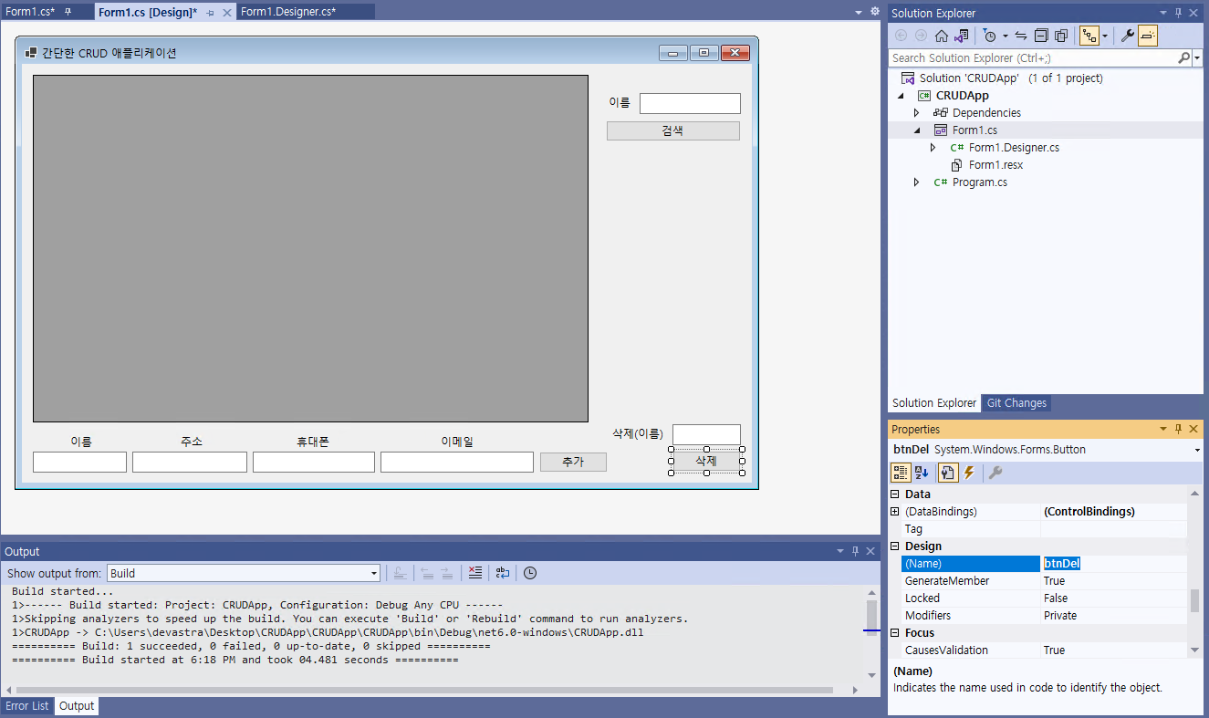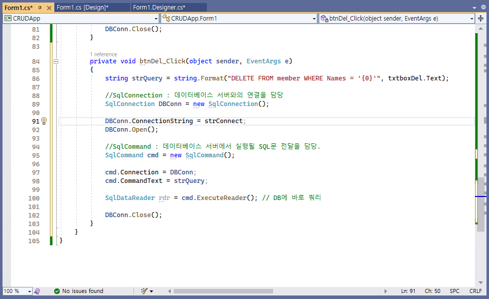 - @[삭제]@ 버튼을 더블 클릭하여 아래의 코드를 추가해준다. 그리고 프로그램을 실행하여 실습을 진행해본다.