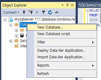 - 개체 탐색기에서 @Databses@를 마우스 오른쪽 버튼으로 클릭한 후, @[새 데이터베이스(New Database)]@를 선택한다. 생성되는데 시간이 걸린다. 데이터베이스를 생성한 후, 애저 포털의 리소스 그룹 페이지(@RG111@)에서 해당 데이터베이스가 생성되었는지 확인해본다.