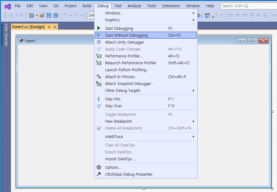 - 우선, 프로그램을 실행해본다. 앞으로 프로그램을 실행하기 위해 다음과 같이 @[Debug]@ 메뉴 > @[Start Without Debugging]@ (단축키 @[Ctrl]@ + @[F5]@)을 클릭해줄 것이다.