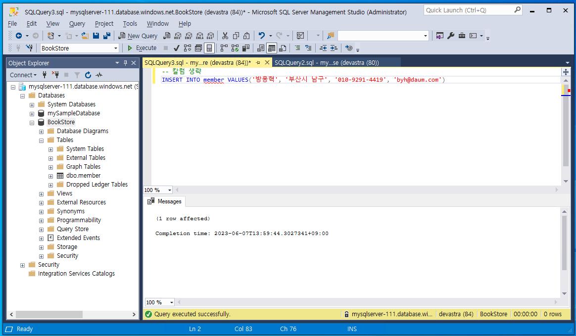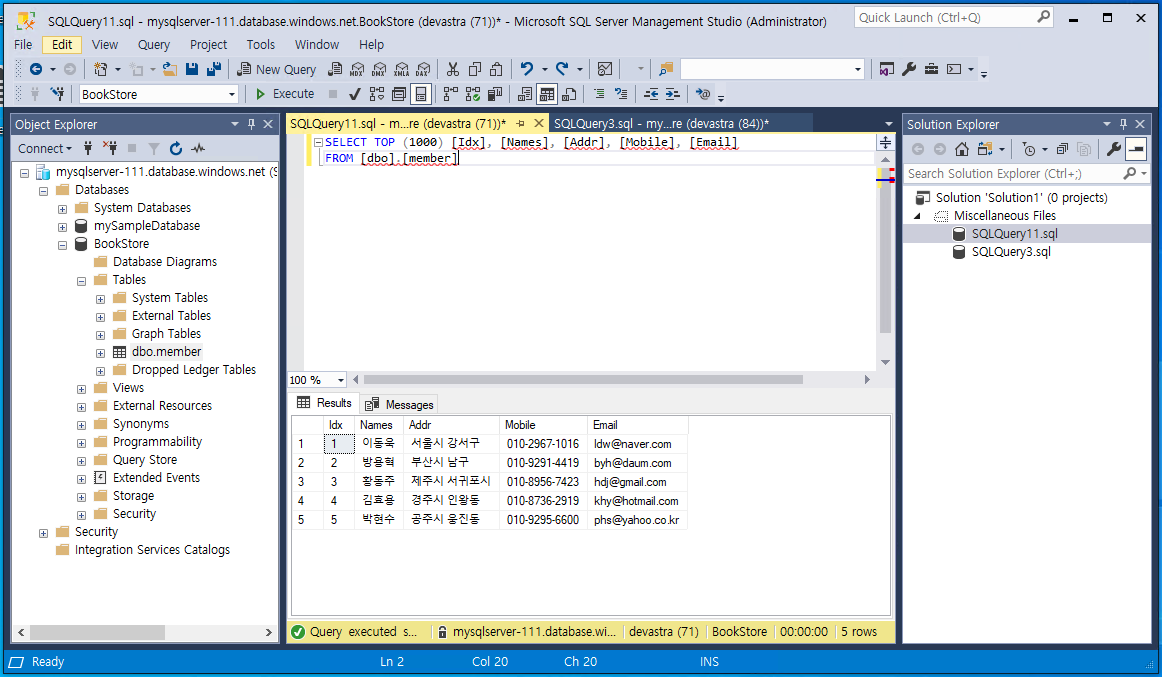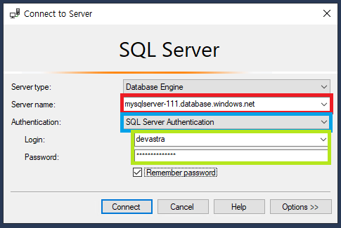 string strConnect = "Server = mysqlserver-111.database.windows.net; database = BookStore; uid = devastra; pwd = **********;"; // 연결 문자열