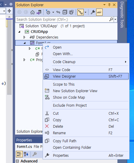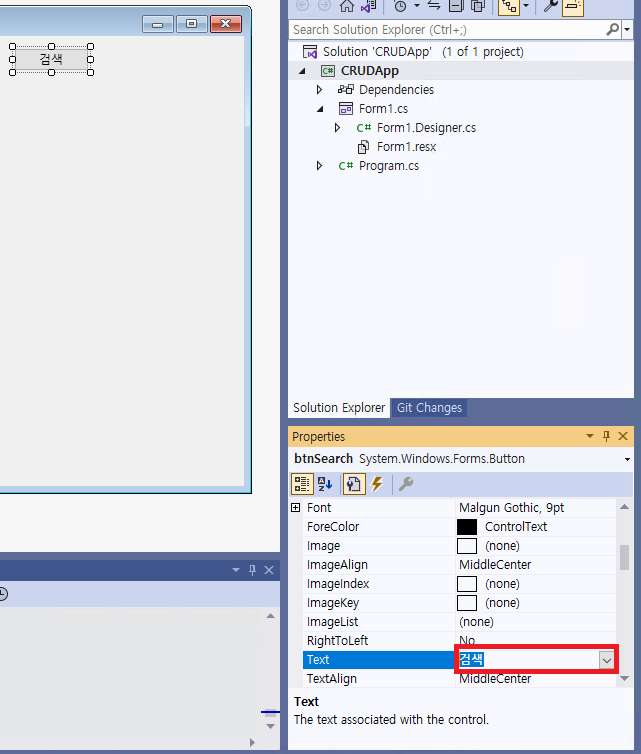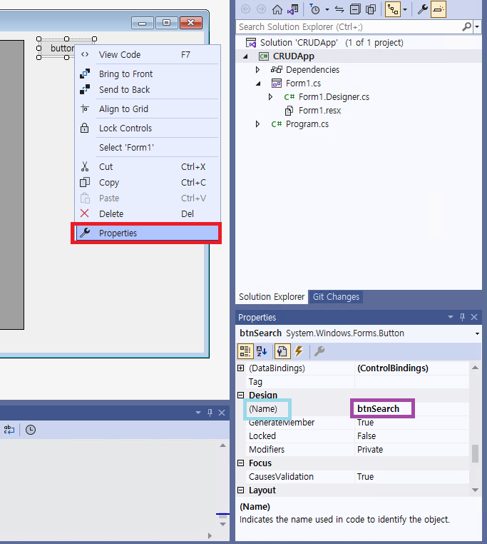 - 다음과 같이 버튼(@Button@)을 한 번 클릭한 후, 마우스 오른쪽 버튼 > @[Properties]@를 클릭한다. 그리고 @[(Name)]@을 @btnSearch@로 지정해준다. 그리고 @[Text]@를 @검색@으로 지정해준다.