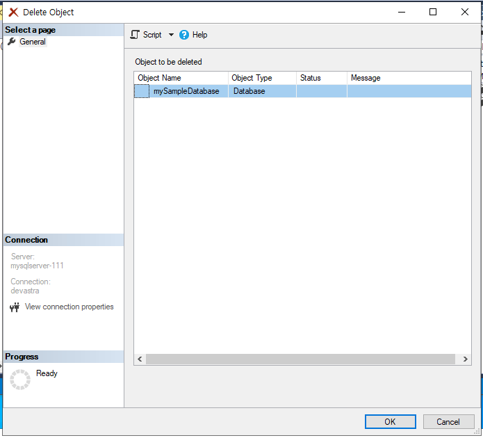 - 작업의 편의를 위해서 실습에 필요 없는 기존의 데이터베이스(@mySampleDatabase@)를 삭제해준다.