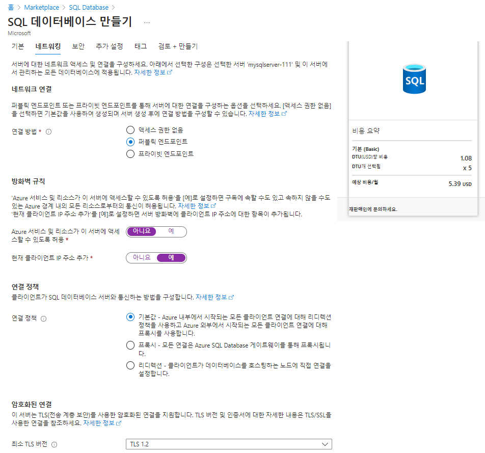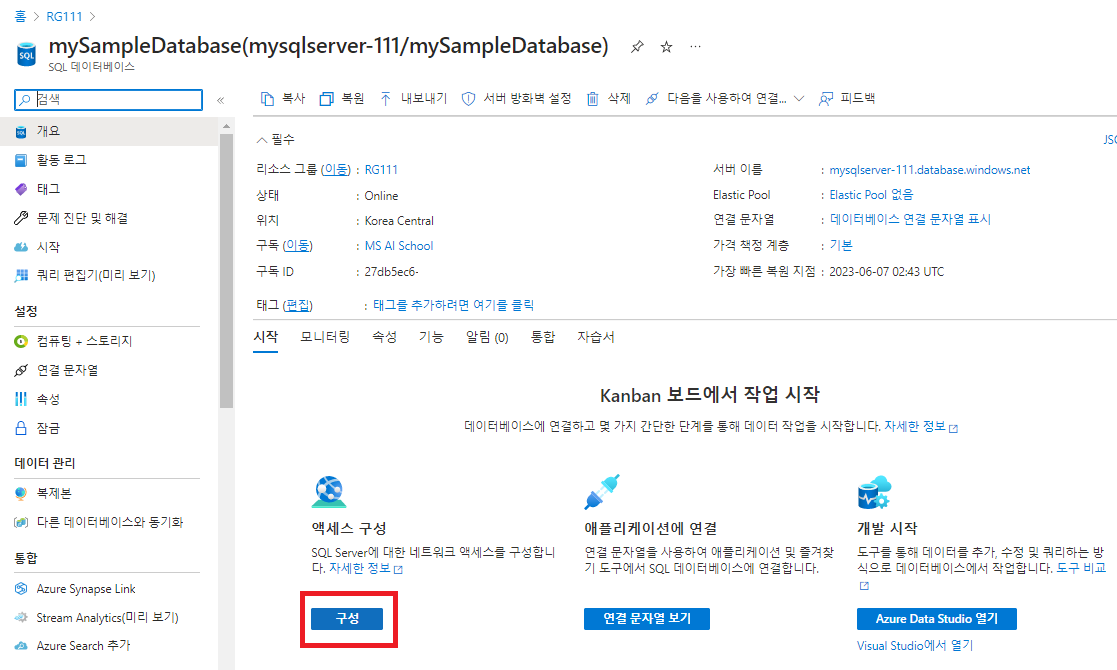 참고) 실습 전, 애저의 SQL Database 페이지에서 다음과 같이 설정되었는지 확인해본다.