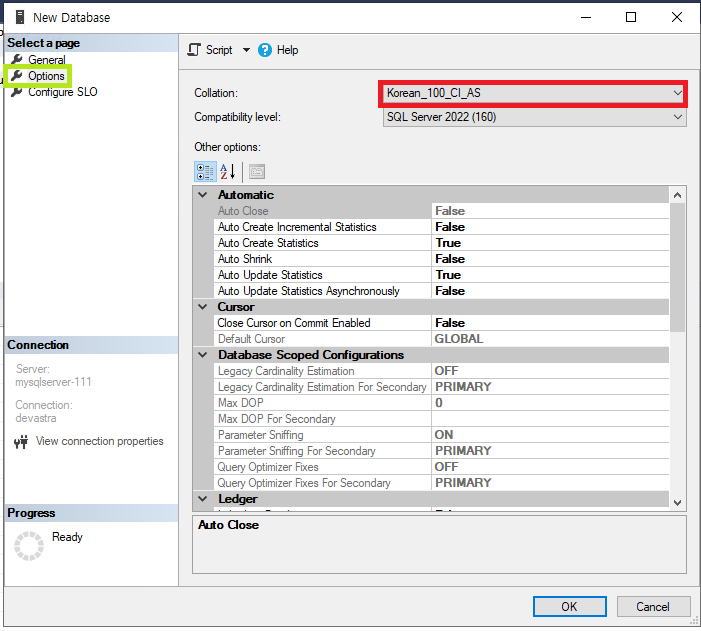 - [Options] 탭에서 [Collation]을 @[Korean_100_CI_AS]@로 설정한다.